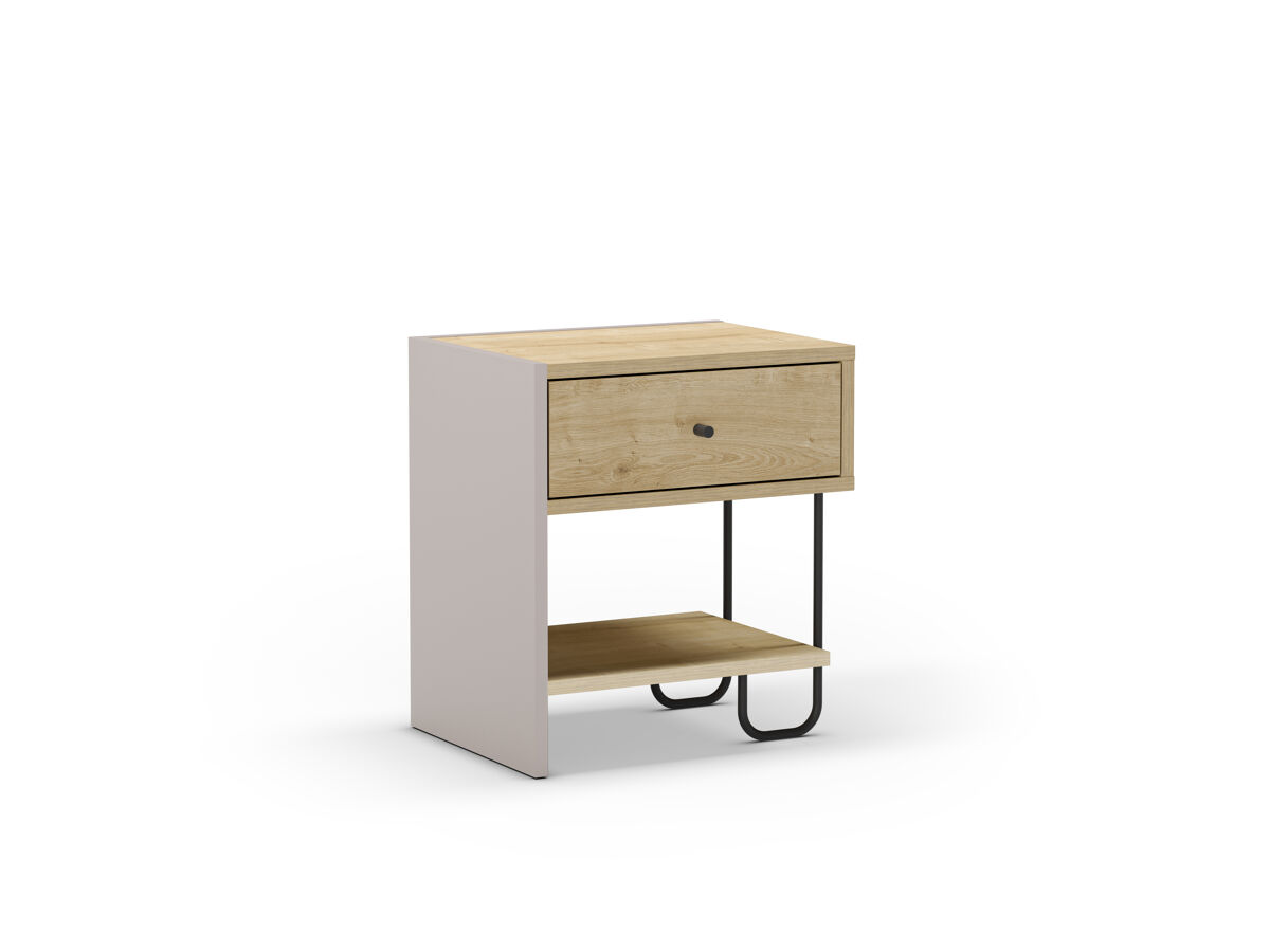 Esta mesita combina la calidez natural de la melamina en tono madera con la suavidad del acabado moca y la firmeza de sus patas metálicas en negro, logrando un equilibrio entre modernidad y serenidad. Su diseño funcional incluye un cajón superior ideal para guardar objetos personales y una repisa inferior que ofrece espacio adicional para libros o elementos decorativos. Las líneas limpias y el contraste sutil de materiales aportan un aire contemporáneo con matices escandinavos, haciendo de esta pieza una opción perfecta para dormitorios, salones o recibidores. Su tamaño compacto y su estilo versátil permiten integrarla fácilmente en distintos ambientes, aportando orden, luminosidad y un toque de diseño actual al espacio.