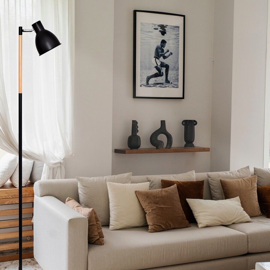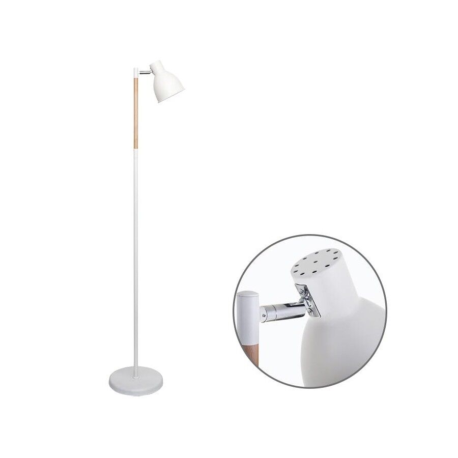 Dentro de la sección Flexos, les presentamos el artículo lámpara de pie DELZA. Las dimensiones de este modelo de Pie de salón son de 147 cm de alto, 33 cm de diámetro, en blanco, madera natural. Este modelo necesita 1 bombilla E27.
