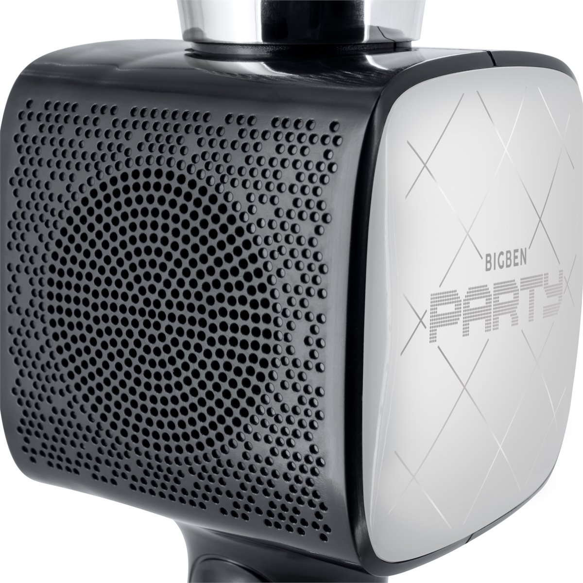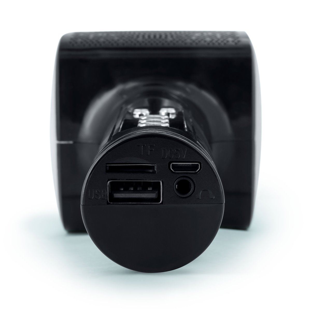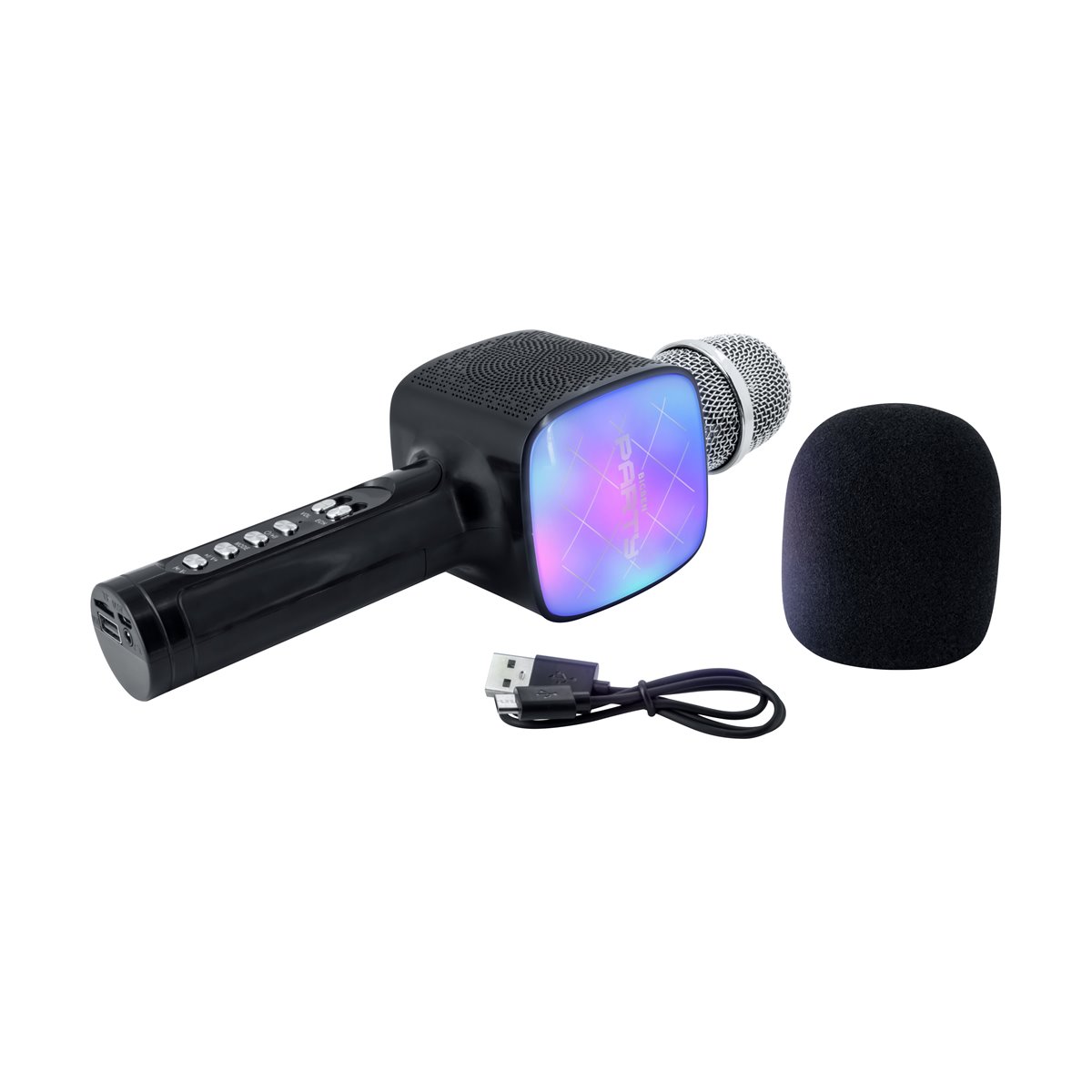 Micrófono estéreo con altvoz y efectos luz.Funda protección, paravientos.Entrada USB y TF.Entrada para auricular de 3,5mm.Bateria recargablede 1800mAh para 6 horas de autonomía.Potencia musical total 15 Watts