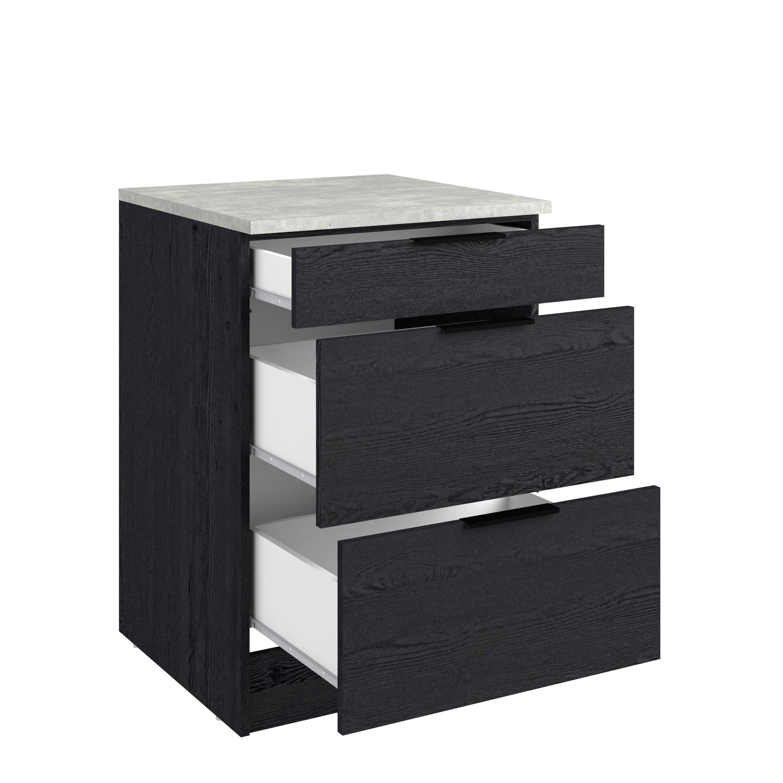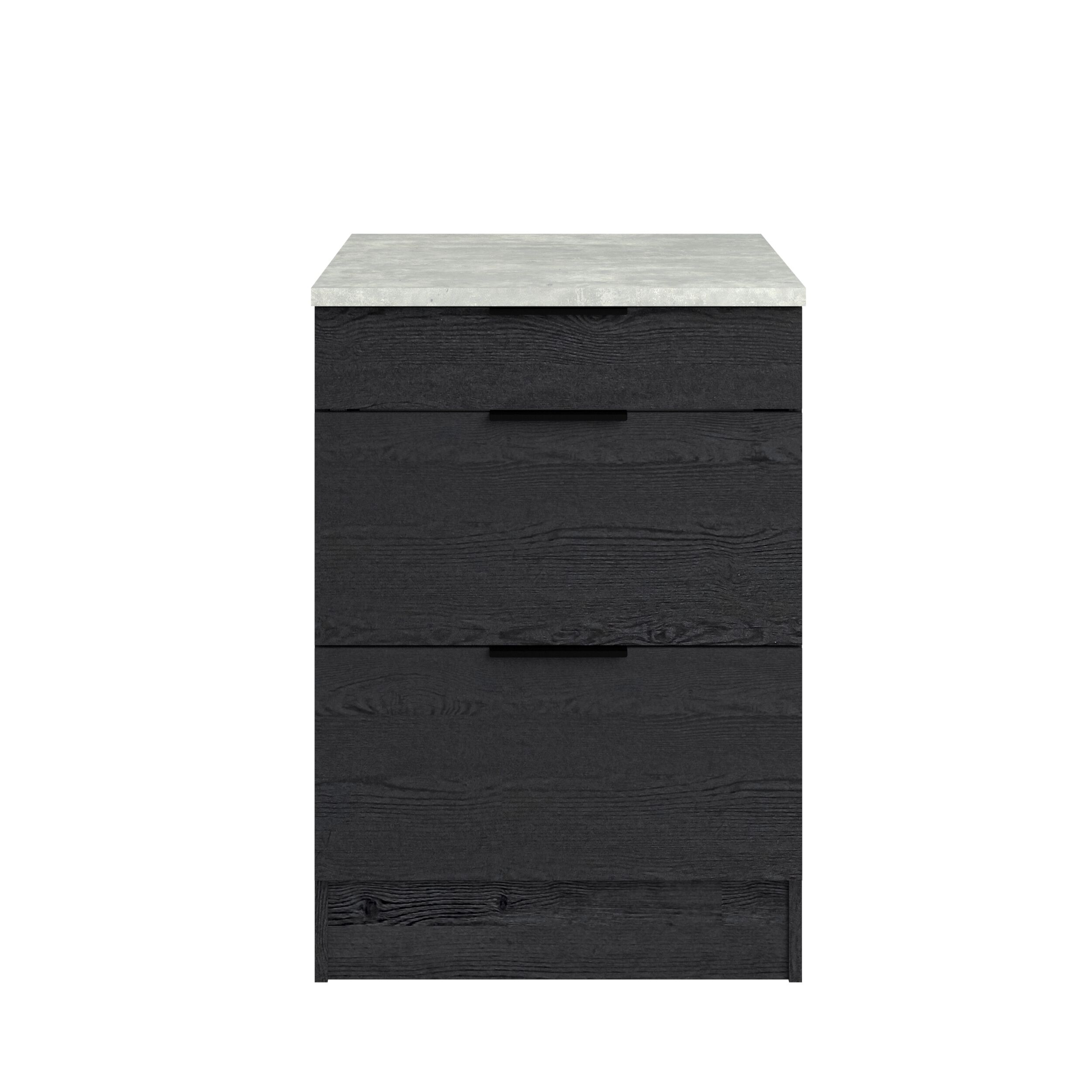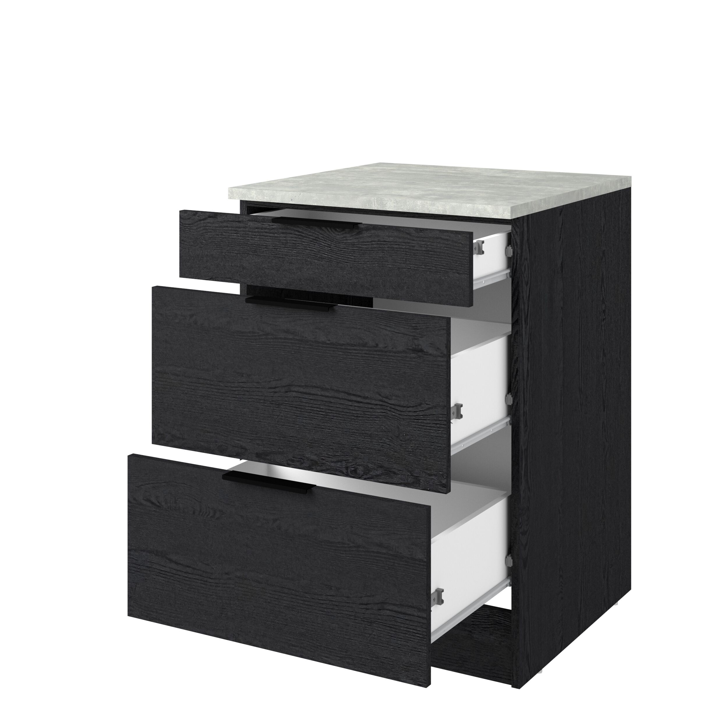 Módulo bajo ANNA de 60 cm con tres cajones. Mueble fabricado en panel de partículas, con un grosor de 15, 16 y 22 mm. Medidas: L60,1 x H86,8 x P60 cm.