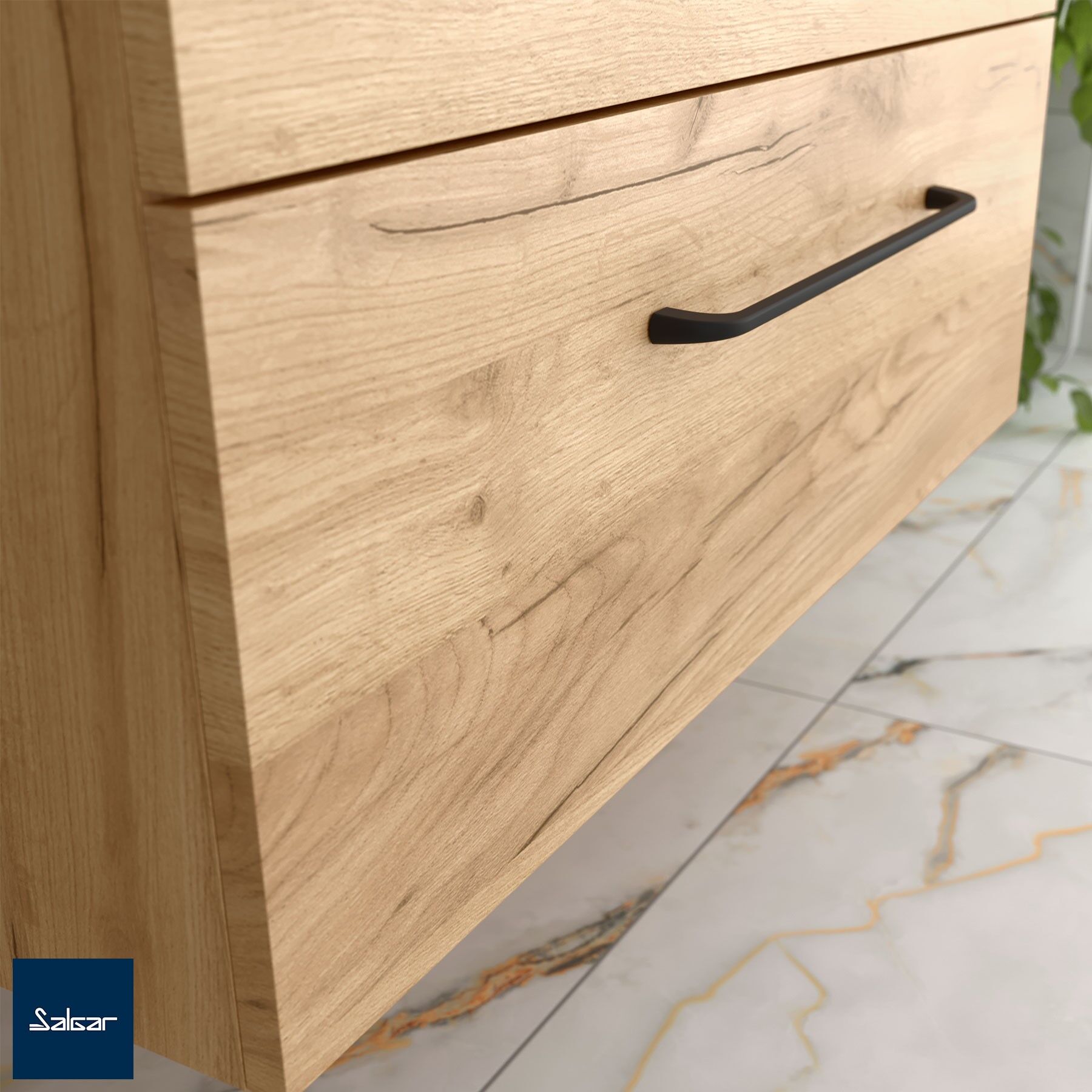 - Apertura con tirador de asa, situado en la parte superior del mueble. Mueble pretaladrado para colocar el tirador.