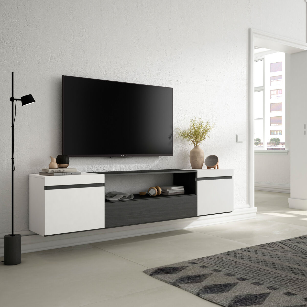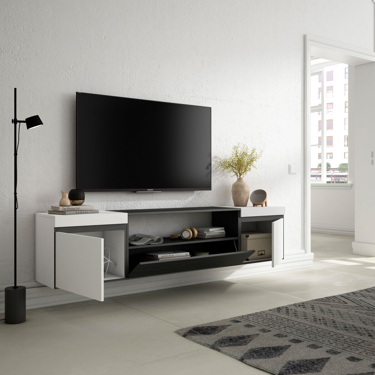 Módulo Tv con puerta, gran capacidad de almacenaje. Medidas del Módulo: 51cm. de Ancho, 45cm. de Alto, 35cm. de Profundidad. Color blanco sólido mate y negro con veteado de madera de tacto poroso de alta calidad.