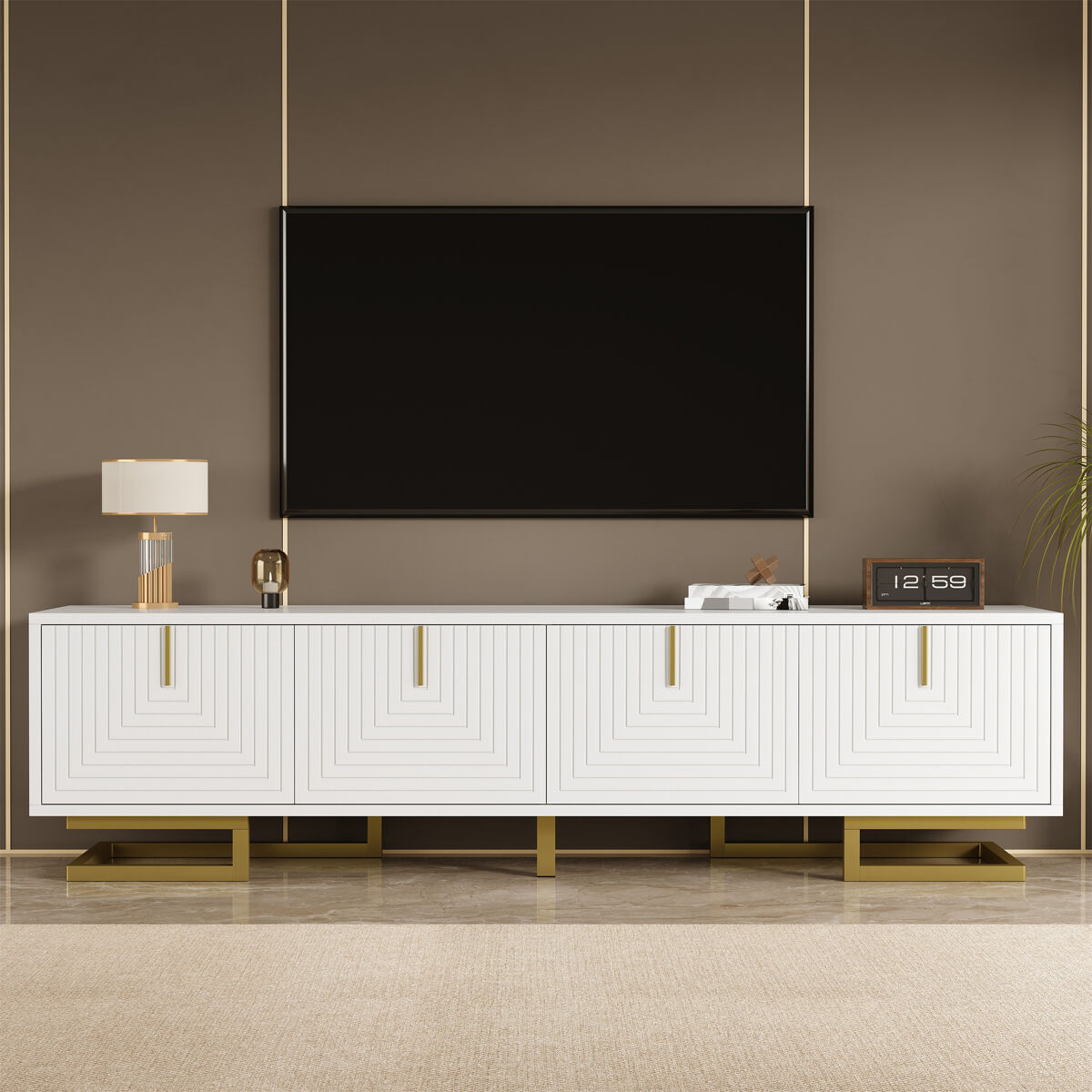 Este elegante mueble para TV luce un acabado sofisticado, y las líneas únicas de los paneles de las puertas crean un elegante juego de luces y sombras.
