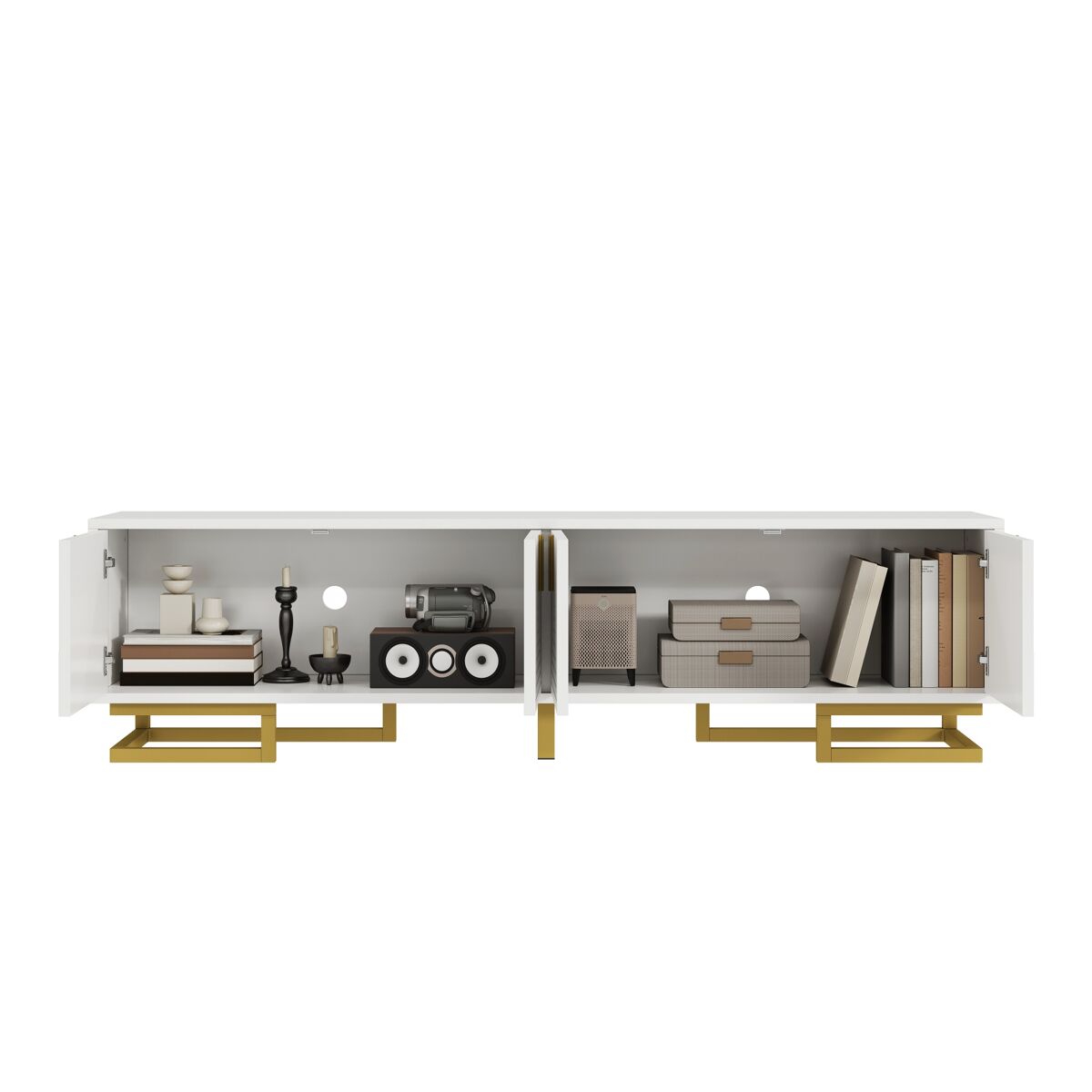 Cuenta con cuatro puertas con estantes integrados, lo que proporciona un amplio espacio de almacenamiento para tus dispositivos multimedia y accesorios.