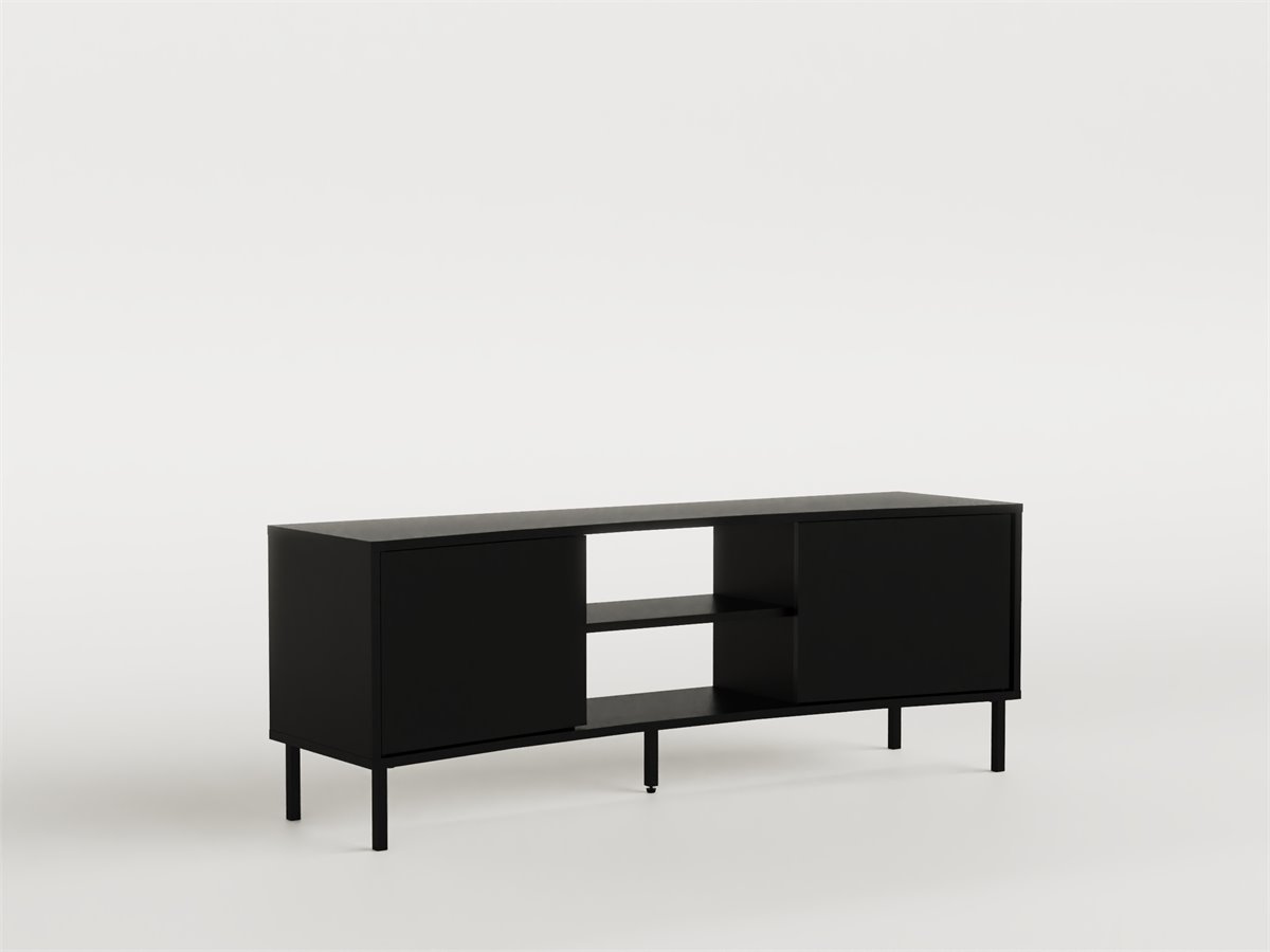 Con un diseño contemporáneo y robusto, el mueble de TV Diora 160cm color negro combina funcionalidad y estilo industrial. Sus dos puertas con detalle de rejilla permiten una ventilación adecuada y un acabado moderno. Dispone de un estante interior que crea dos espacios para almacenar y organizar, además de un estante exterior que añade dos compartimentos adicionales. Medidas totales 160ANX50ALX35FON cm.