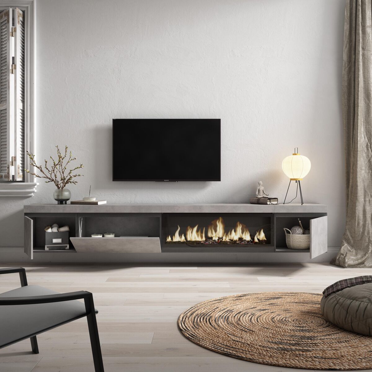 Chimenea Eléctrica LED. Medidas: 107cm. de Ancho, 32cm. de Alto. Efecto de fuego 3D increíblemente realista. Sin riesgos de quemaduras ya que no incorpora ninguna fuente de calor. Potencia: 34w. Incluye mando a distancia y 3 niveles de intensidad.