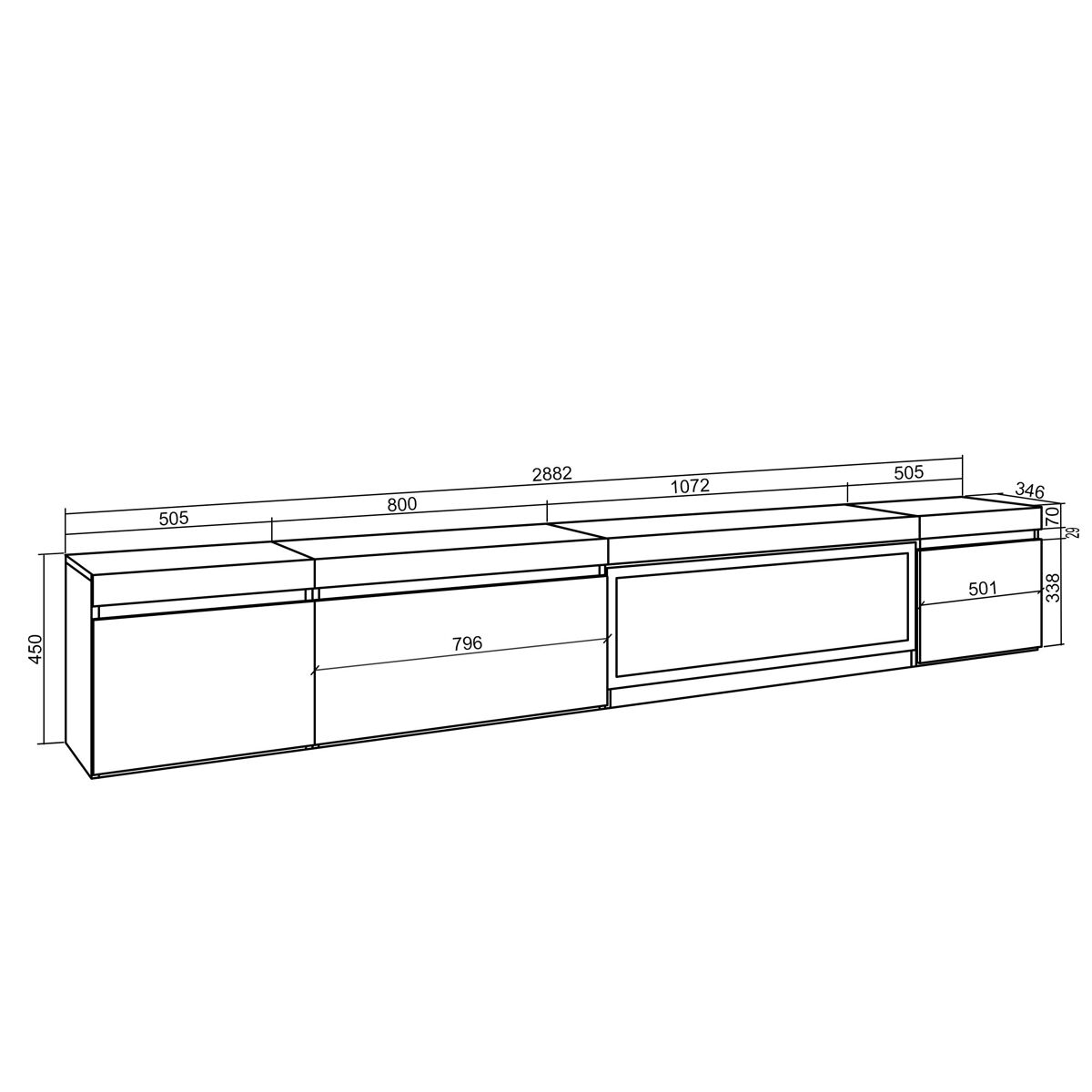 Módulo Tv con puerta, gran capacidad de almacenaje. Medidas del Módulo: 80cm. de Ancho, 45cm. de Alto, 35cm. de Profundidad. Color negro con veteado de madera de tacto poroso de alta calidad.