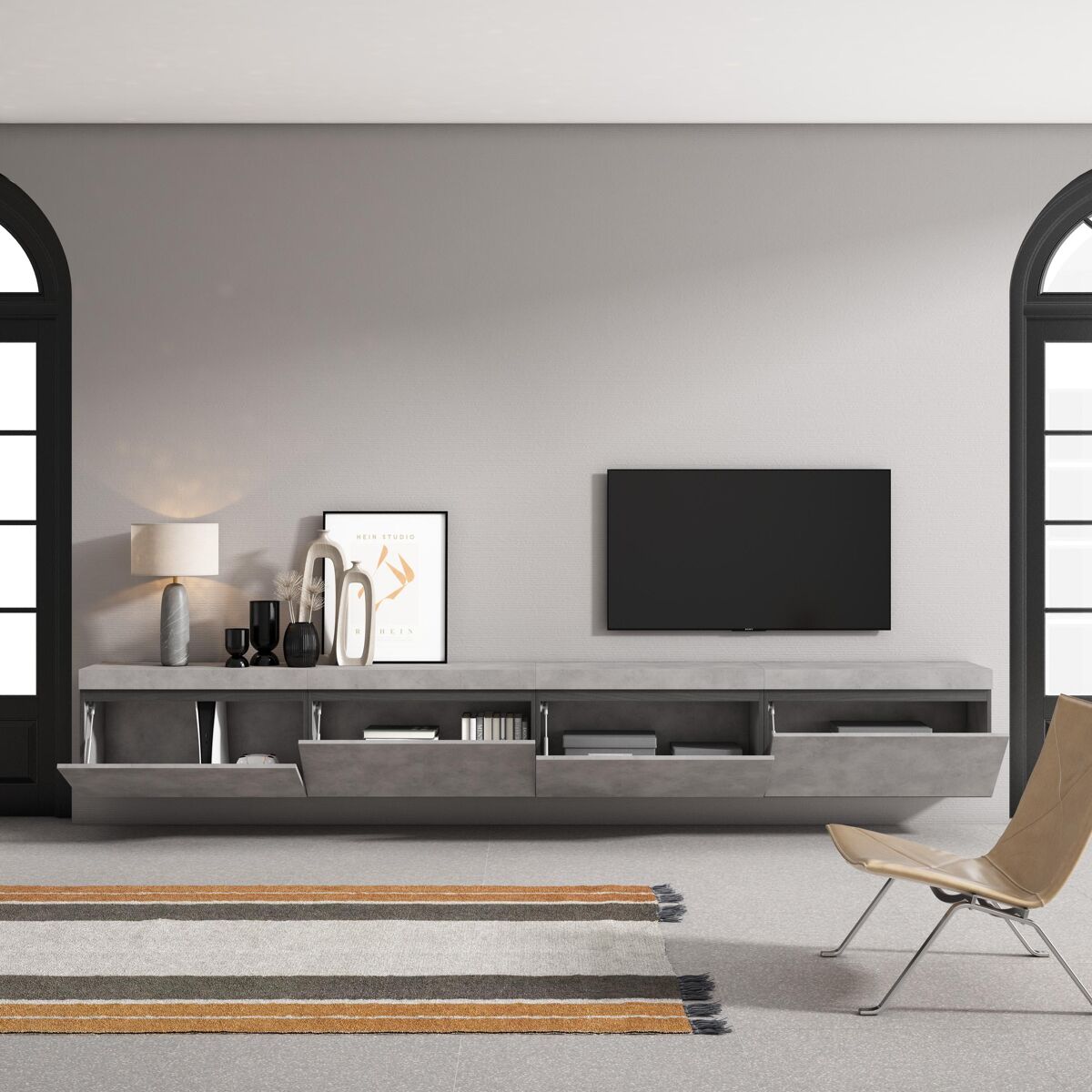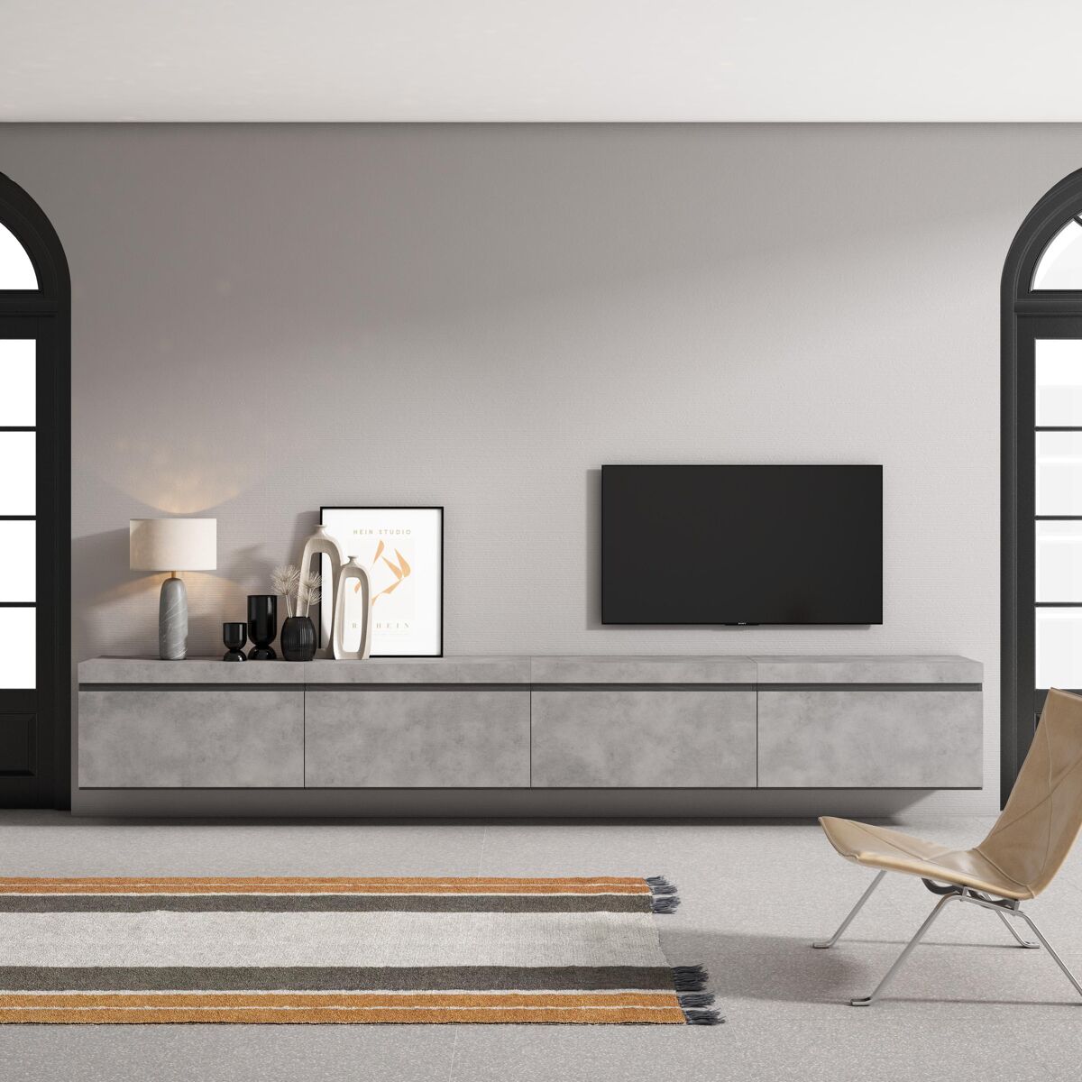 Módulo Tv con puerta, gran capacidad de almacenaje. Medidas del Módulo: 80cm. de Ancho, 45cm. de Alto, 35cm. de Profundidad. Color cemento mate y negro con veteado de madera de tacto poroso de alta calidad.