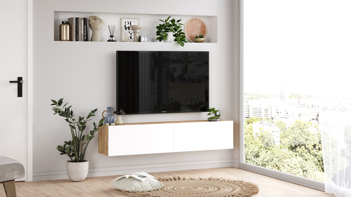 Descubre el mueble tv WALLY, la solución perfecta para tu sala de estar. Con sus impresionantes 140 cm de ancho, este mueble de color pino se adapta a cualquier decoración, aportando un toque de elegancia natural a tu hogar. Fabricado con melamina de alta calidad de 18 mm, combina durabilidad y estilo en un diseño funcional. Ofrece dimensiones ideales (140 cm de ancho, 31,6 cm de alto y 29,6 cm de fondo), para maximizar tu espacio sin comprometer la estética. La atractiva combinación de color pino/blanco, aporta calidez y versatilidad, complementando perfectamente tanto estilos modernos como tradicionales