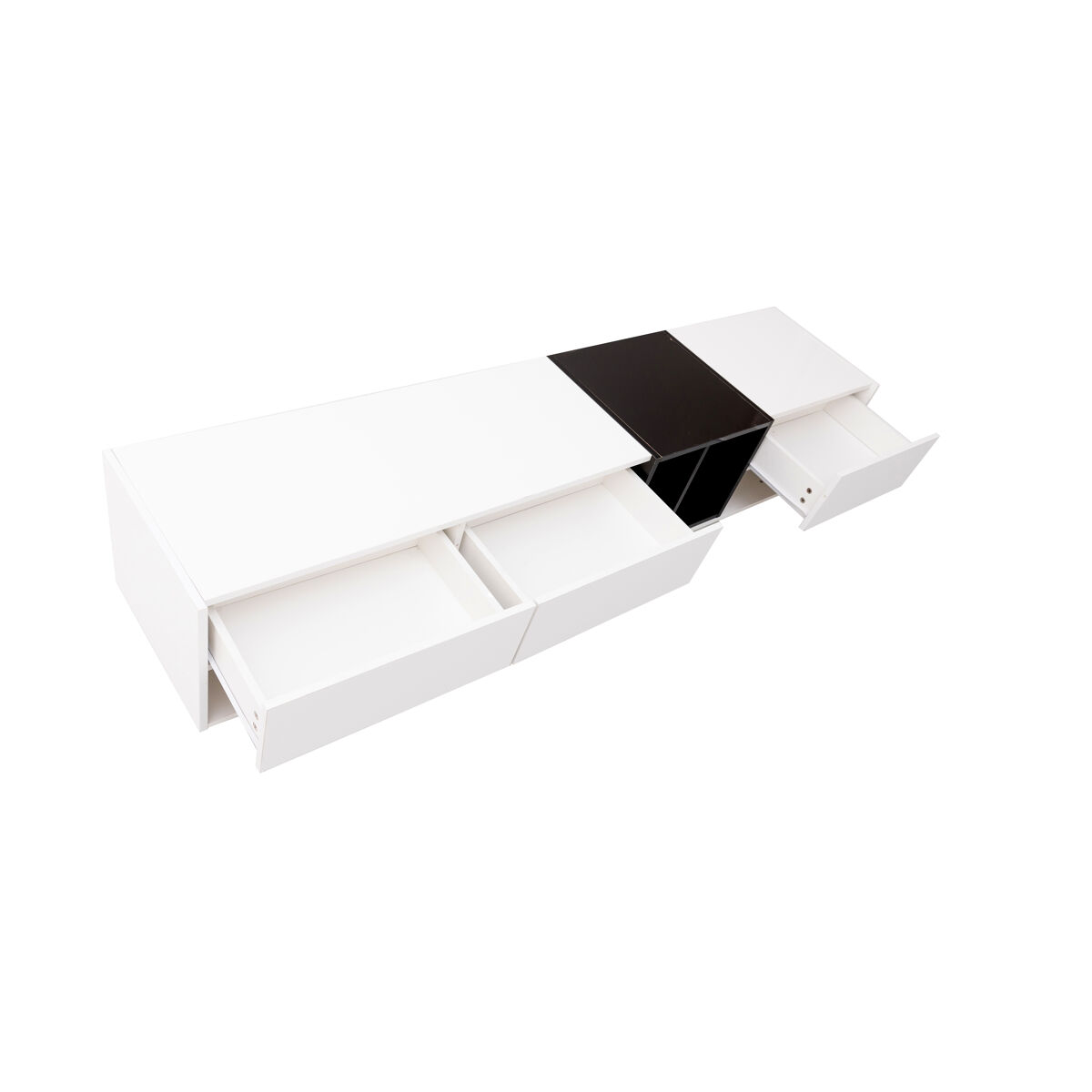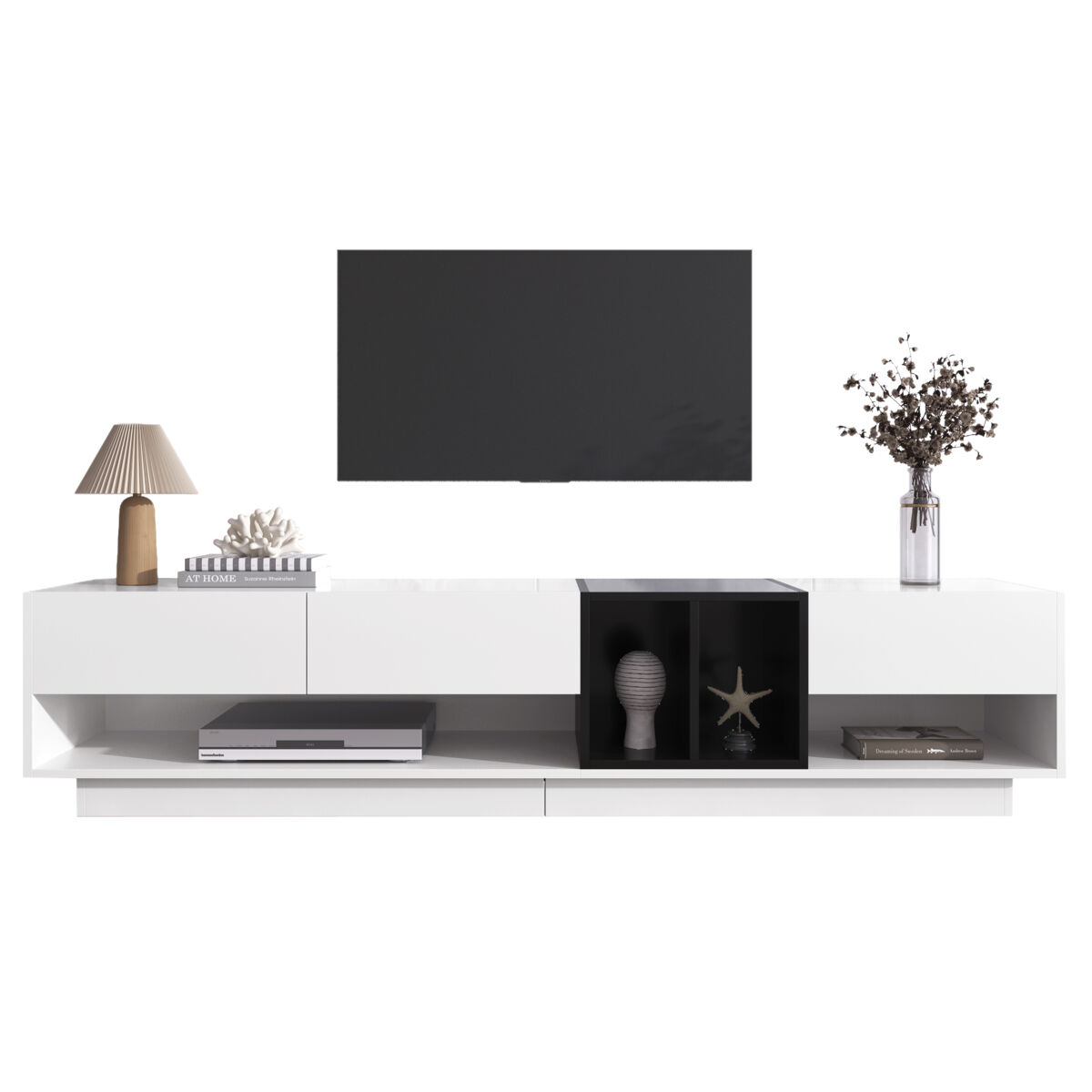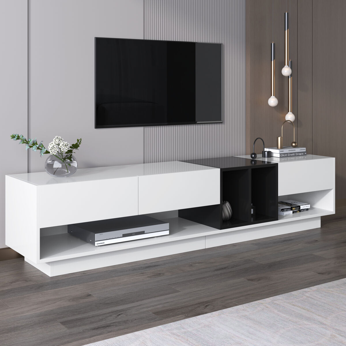El uso audaz del blanco brillante y negro intenso le da a este mueble para TV un toque moderno y artístico.