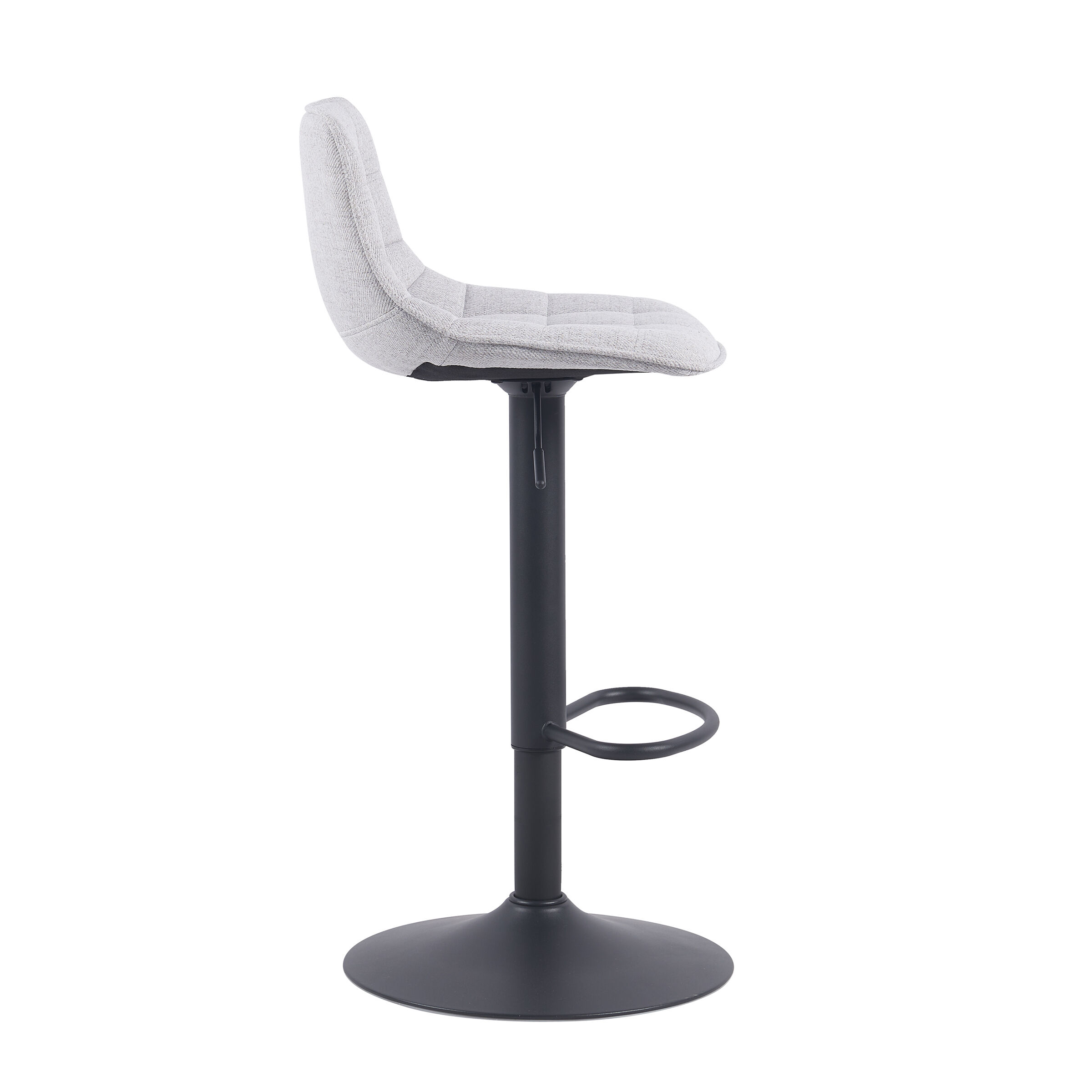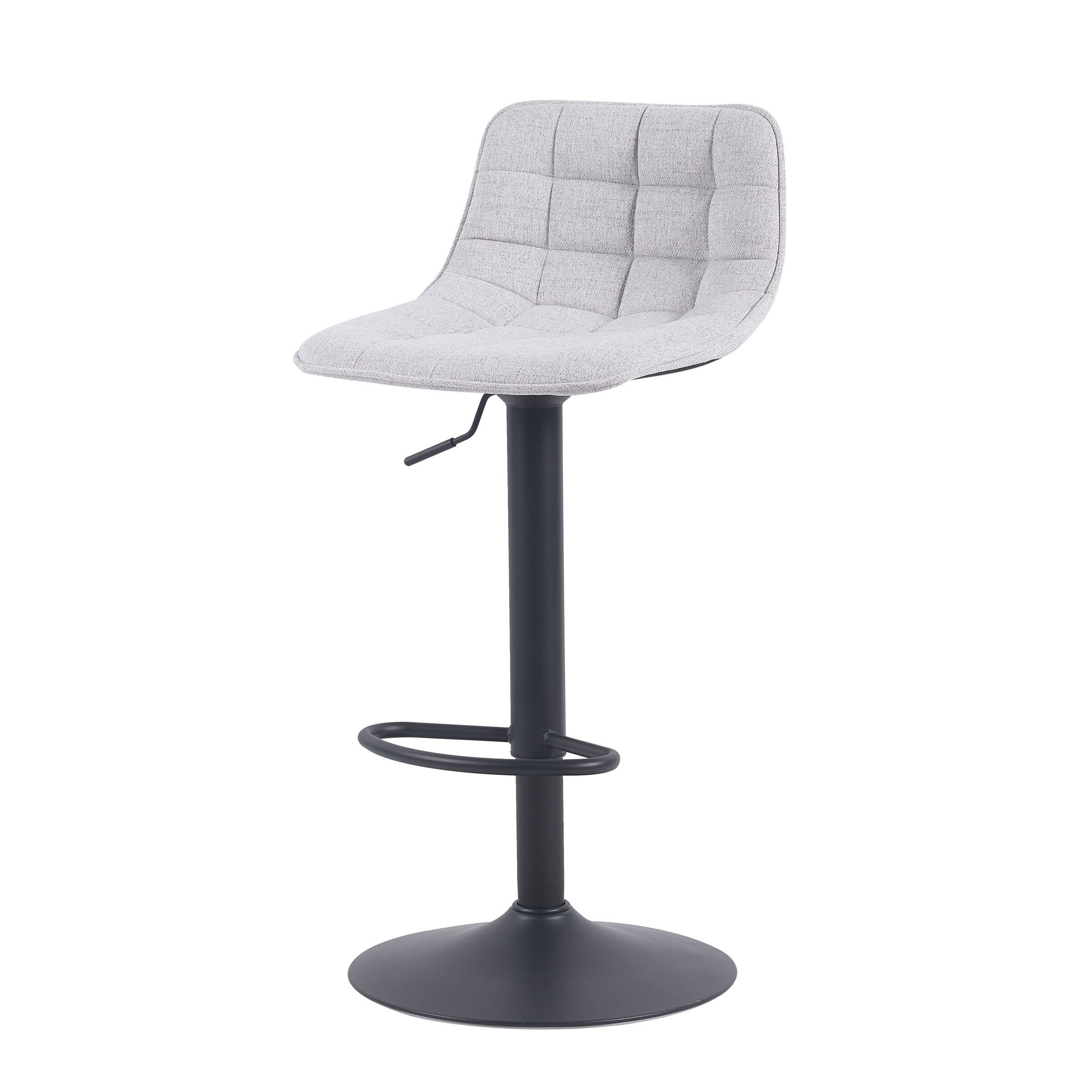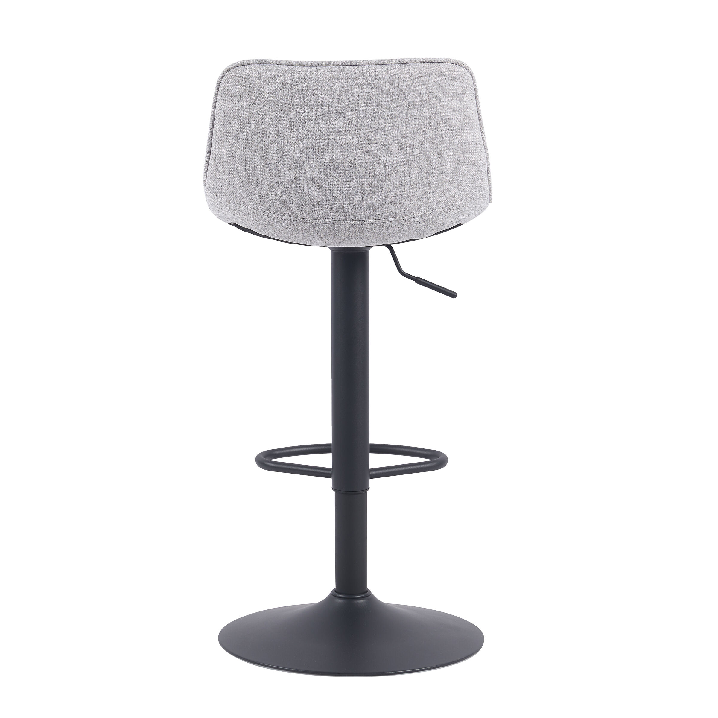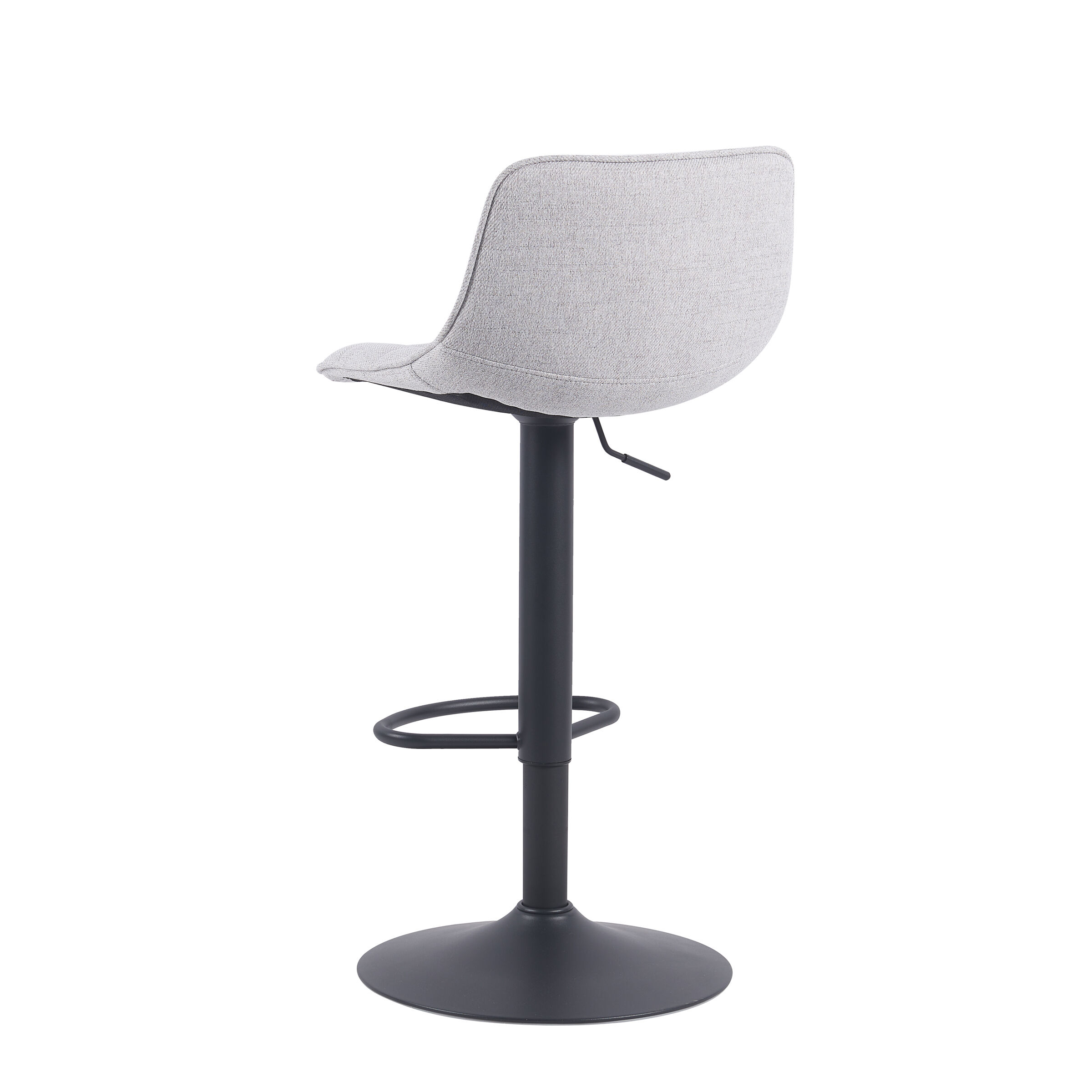 Taburete ajustable ADAM gris. Bonito taburete giratorio ajustable en altura de diseño moderno y contemporáneo. Su asiento y respaldo son muy cómodos gracias a que están acolchados con espuma y tapizados con tela. Además, al ser giratorio, ajustable en altura y con reposapiés nos permite elegir la altura y postura perfecta para nosotros. Con su resistente estructura metálica en color negro, la cual proporciona estabilidad. El taburete ajustable ADAM gris es perfecto para mesas altas o barras.