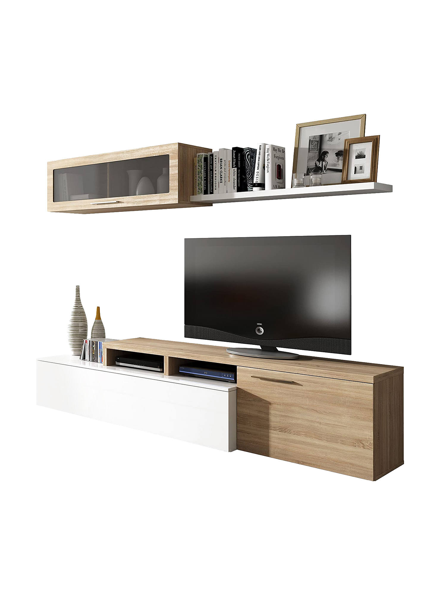 Sistema de parede Dbarb, móvel de sala de TV, Composição reversível de sala, Conjunto de sala de canto, 200x41h44 cm, Carvalho e Branco Brilhante.