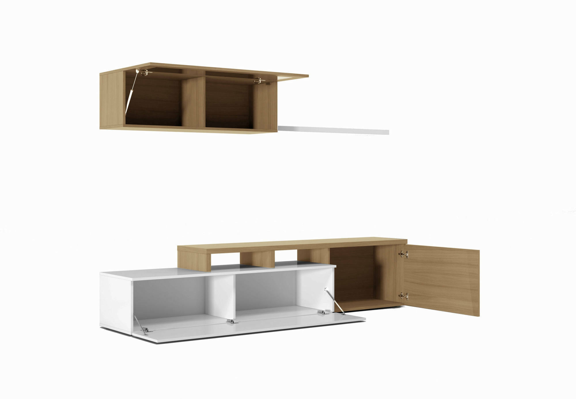 CARACTERÍSTICAS TÉCNICAS - Produto fabricado em madeira laminada com espessura de 30 e 15 mm, material resistente a impactos e riscos, de longa duração e impermeável - Encosto em painel MDF de 3 mm - Pinos ABS anti-ruído e anti-riscos na parte inferior dos móveis - Dobradiças em metal para as portas - Sistema de abertura push para o módulo de TV - Pistão de 80 Nw para a porta com abertura basculante - Puxadores metálicos com efeito cromado - A parte traseira do módulo está equipada com uma abertura para cabos - Classificação de acordo com o conteúdo ou liberação de formol do TIPO E1 - Peso máximo suportado da base do suporte de TV: 40 Kg - Peso máximo suportado do armário de parede: 15 Kg - Peso máximo suportado do armário de prateleira: 5 Kg.