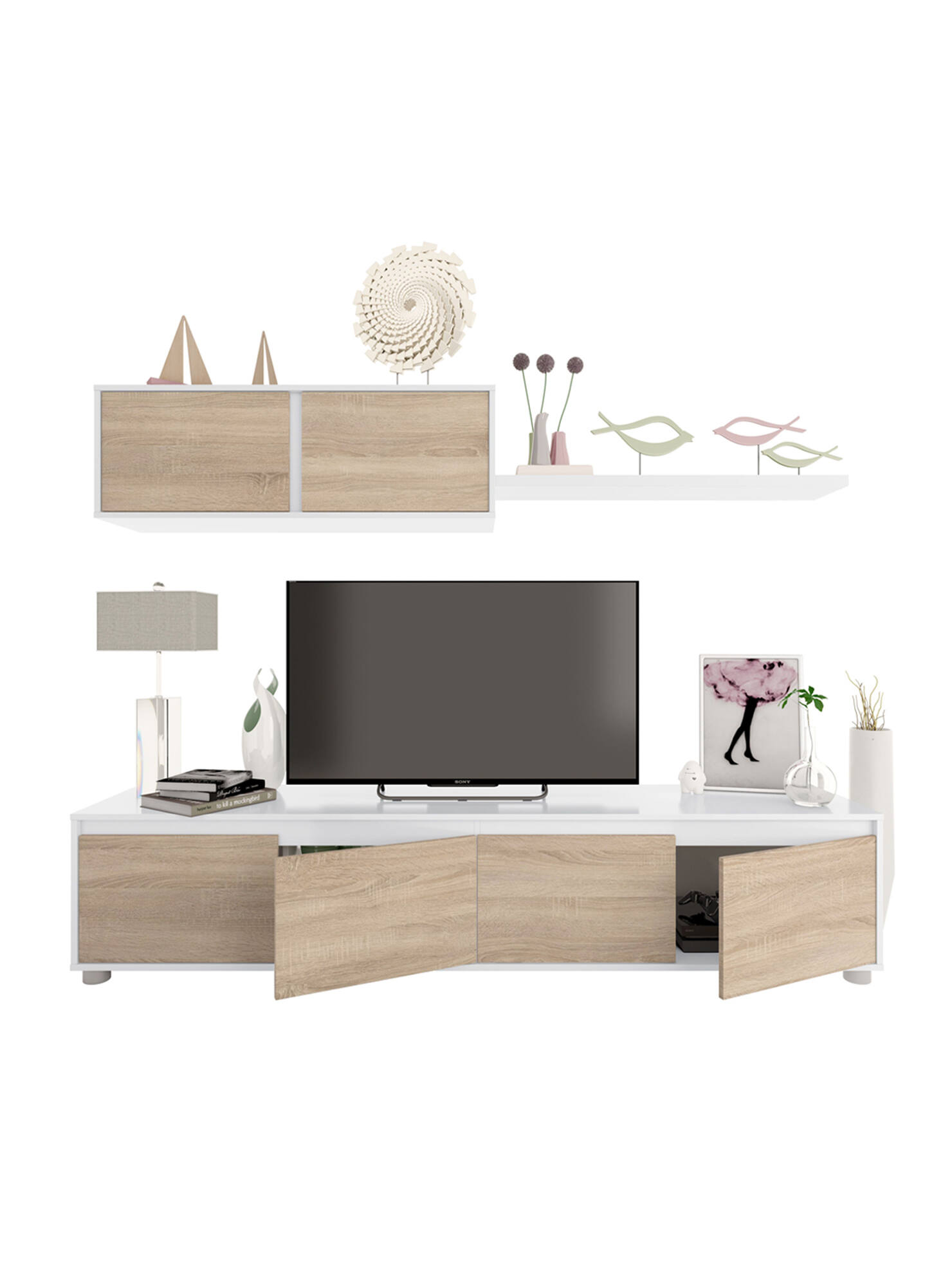 ESTRUTURA E UTILIZAÇÃO - Móvel de TV para sala composto por base de móvel de televisão com quatro portas articuladas, móvel suspenso e prateleira, prateleiras fixas internamente - A escolha dos vários móveis que compõem este conjunto de sala tornam o design de este móvel moderno é funcional e economiza espaço - Além de posicionar a TV, você pode personalizar a parede com seus enfeites preferidos que ficarão expostos nas prateleiras - O espaço interno das portas é perfeito para guardar seus livros e documentos de maneira organizada, objetos decorativos ou louças - Conjunto de sala perfeito para decorar uma sala de estar, sala de jantar ou uma sala open space.