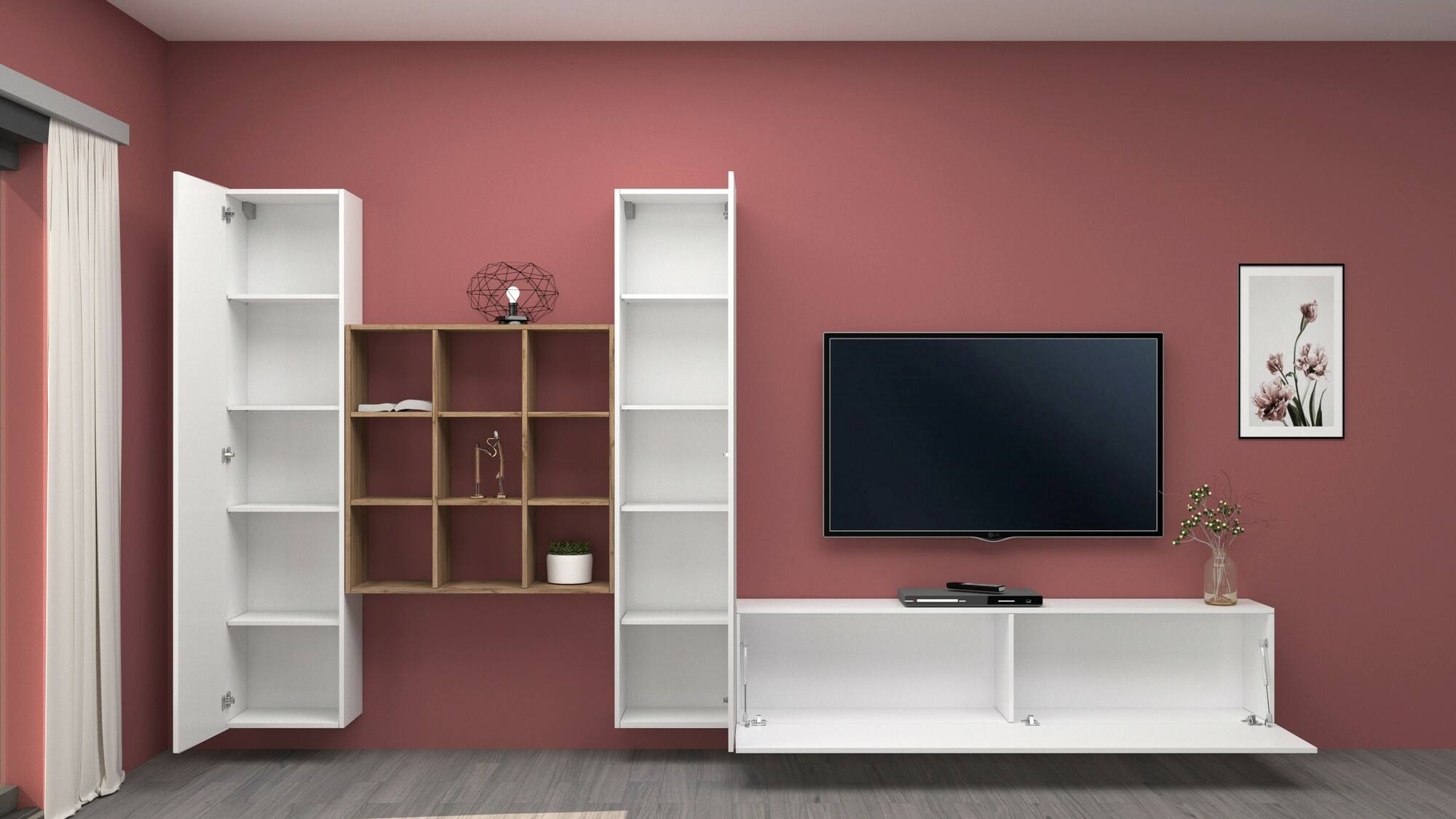 ESTRUTURA E UTILIZAÇÃO - Móvel de TV para sala composto por uma base de móvel de televisão e duas colunas, roupeiros com portas sanfonadas e de batente e uma estante com diversas prateleiras - A escolha dos vários móveis que compõem esta composição de sala fazem o design deste artigo móveis modernos, funcionais e que economizam espaço - Além de posicionar a TV, você pode personalizar a parede com seus enfeites preferidos que ficarão expostos nas prateleiras - O espaço interno das portas e prateleira é perfeito para guardar com cuidado seus livros e documentos, objetos de decoração ou louças de forma ordenada e discreta - Conjunto de sala perfeito para mobiliar uma sala de estar, sala de jantar ou sala open space.