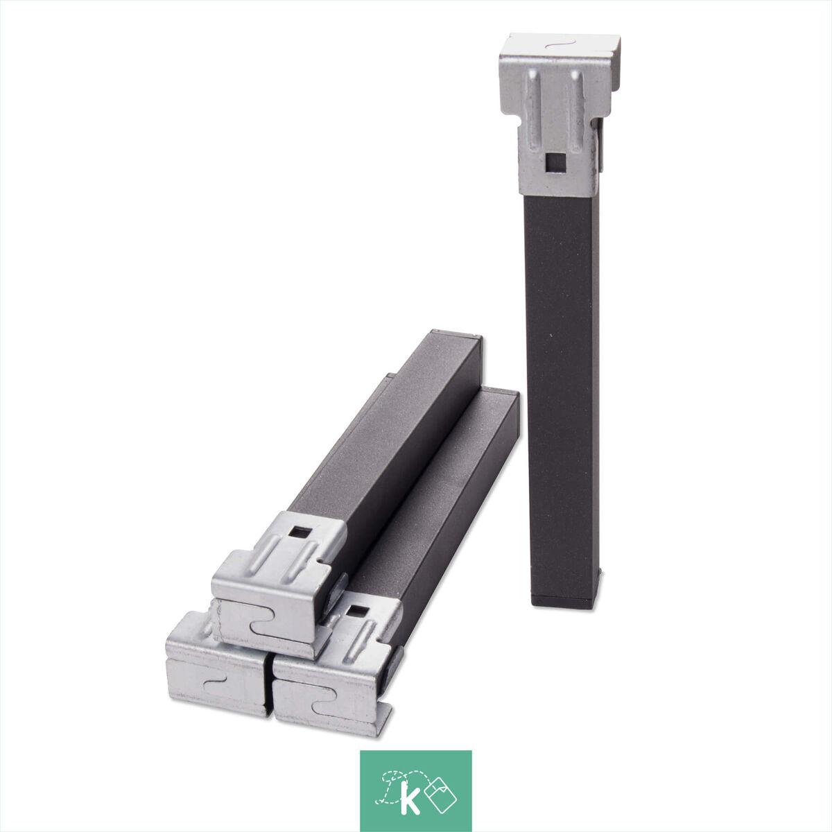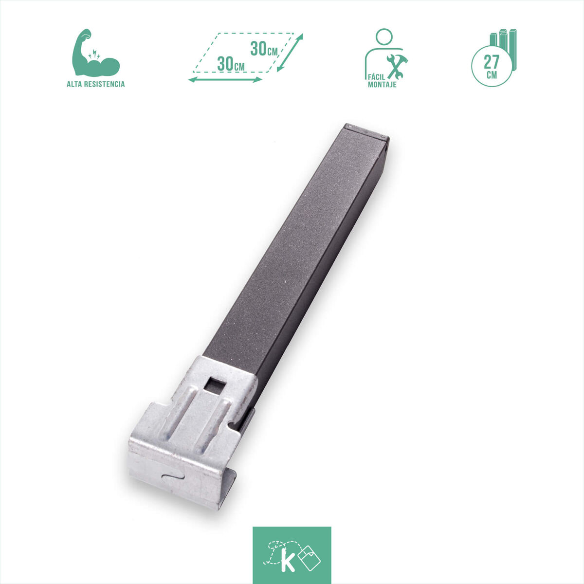 Juego de 4 patas metálicas para somier de estructura 30x30mm. Incluye abrazaderas para adaptarlas fácilmente a la estructura del somier. Altura de las patas de 27cm. Los tornillos necesarios para su montaje viene incluidos en el paquete. Fácil de montar. Producto de gran calidad fabricado en España bajo la normativa europea. Medidas de las patas: 3 cm x 3 cm x 27 cm. Calidad garantizada. 2 años de garantía contra defectos de fabricación.