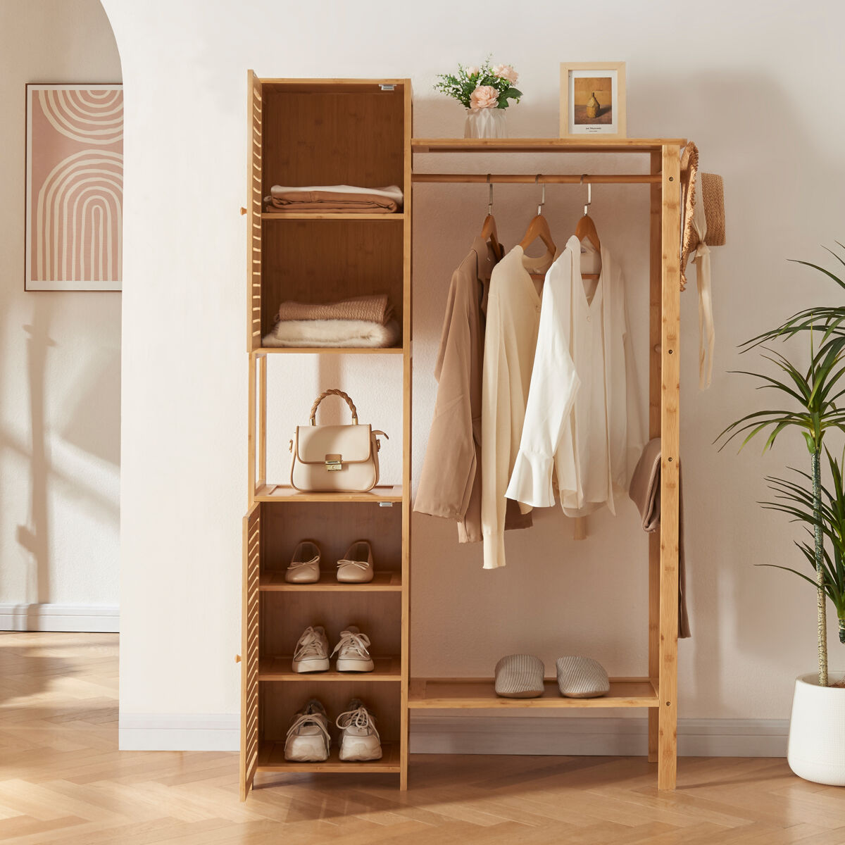 La estructura del armario para ropa clóset está hecha de bambú, que, además de su resistencia a la humedad y durabilidad, impresiona por su aspecto natural, por lo que se integra perfectamente en cualquier hogar.