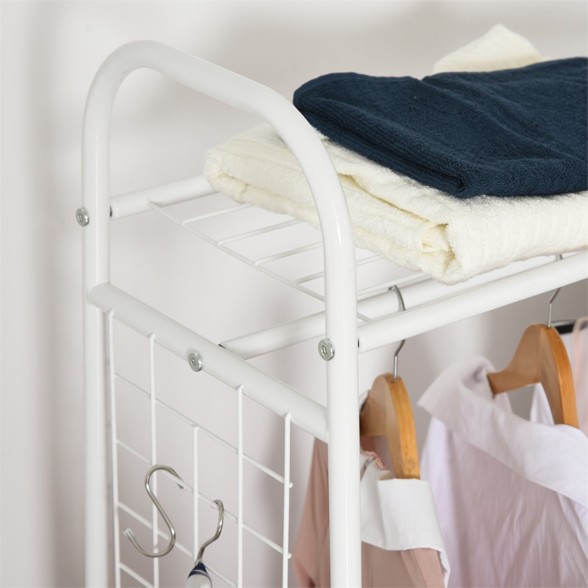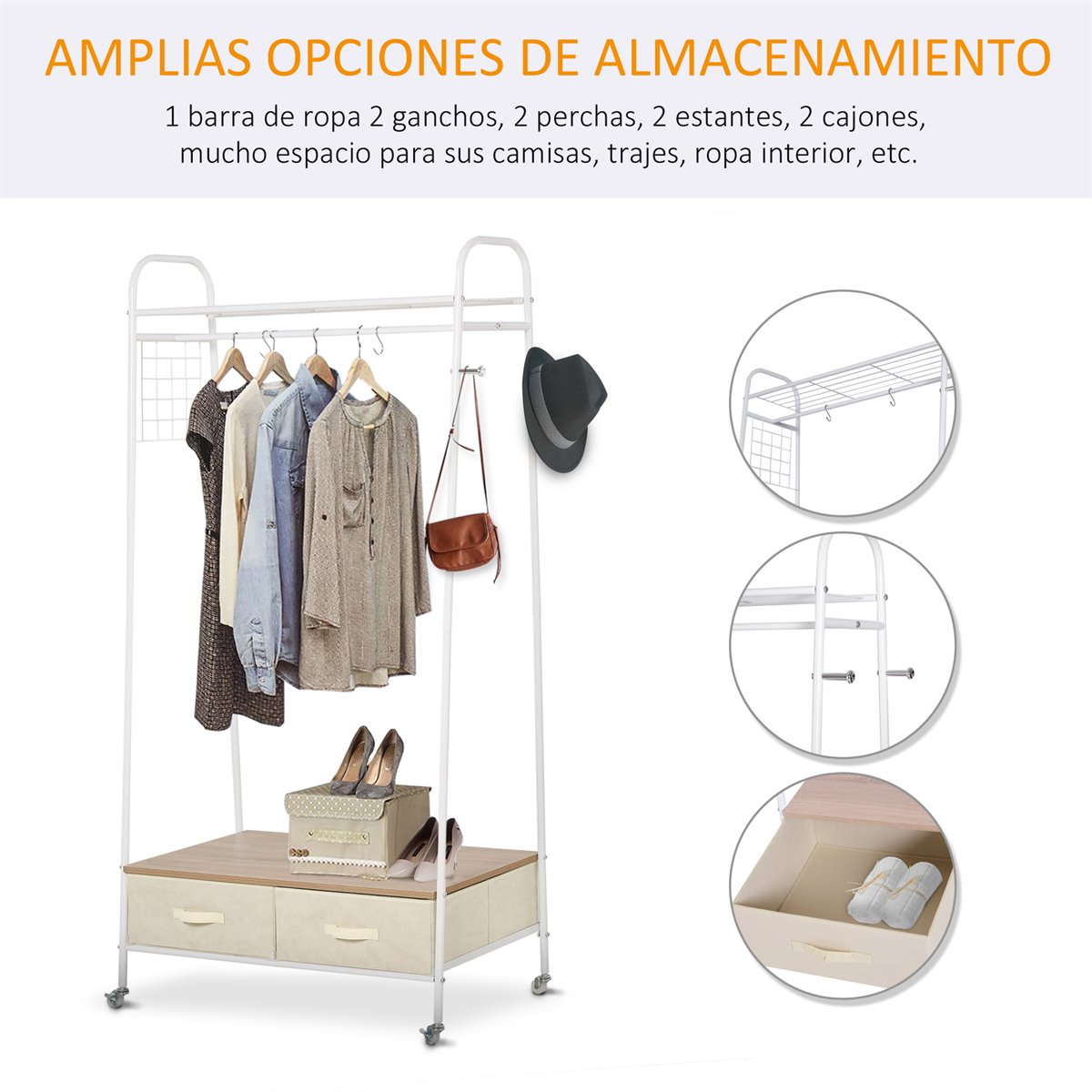 Si desea mantener sus artículos diarios siempre al alcance y bien organizados, te ofrecemos una opción óptima. Cuenta con gran capacidad para colocar su ropa, bolsos, decoraciones y otros accesorios, agregando espacio de almacenamiento adicional. Con 4 ruedas, puede moverse fácilmente de un lugar a otro, y puede bloquearse en su lugar. También incluye 2 estantes cromados y 2 ganchos en forma de S para colgar sus chaquetas, camisas, paraguas, sombreros y más.