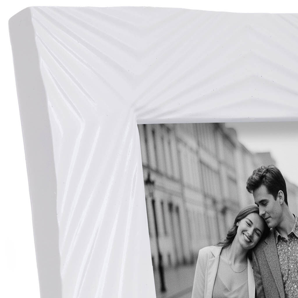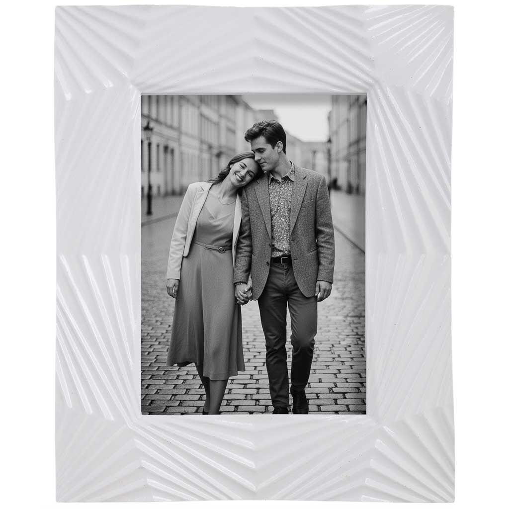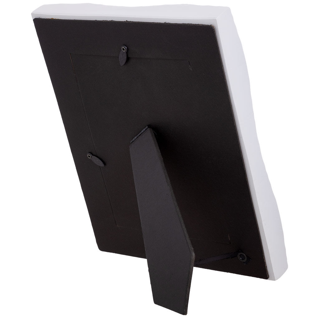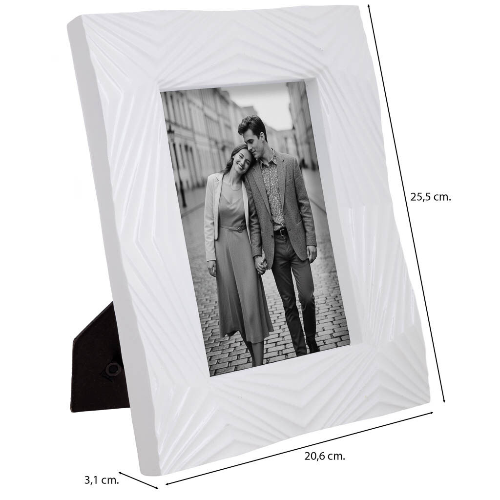 Este porta fotos artesanal con marco blanco lacado aporta frescura y luminosidad al ambiente. Mide 20,6 cm de ancho, 3,1 cm de fondo y 25,5 cm de alto, perfecto para imágenes de 13x18 cm.