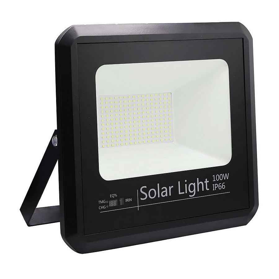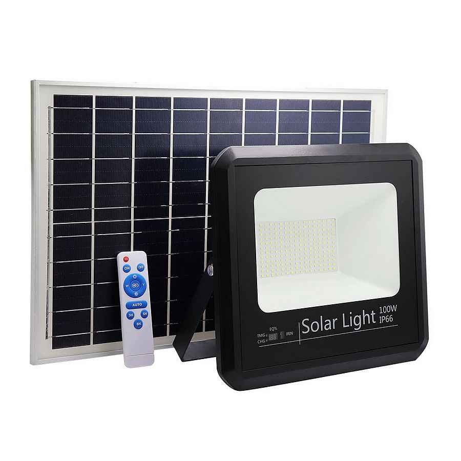 Proyector Solar de la serie MALAQUITA de color NEGRO, realizado en aluminio y cristal. Posee una potencia de 100 watios y 9000 lúmenes, con una temperatura de 6500K, blanco frío, posibilitando así iluminar hasta a una distancia de 15-20 metros. Con BATERIA DE LITIO. Se presenta con un panel solar de fácil instalación y un mando a distancia incluido que permite regular la intensidad de la luz y la desconexión automática del proyector en 3, 5 y 8 horas. Con Display que indica la duración de carga restante, a menor intensidad, mayor el tiempo de encendido. Su ángulo de apertura es de 120 grados, con IP66. Tiene unas dimensiones de 28,5x32x8 centímetros el proyector, y 53x35x2 centímetros el panel y con 5 METROS DE CABLE incluido.