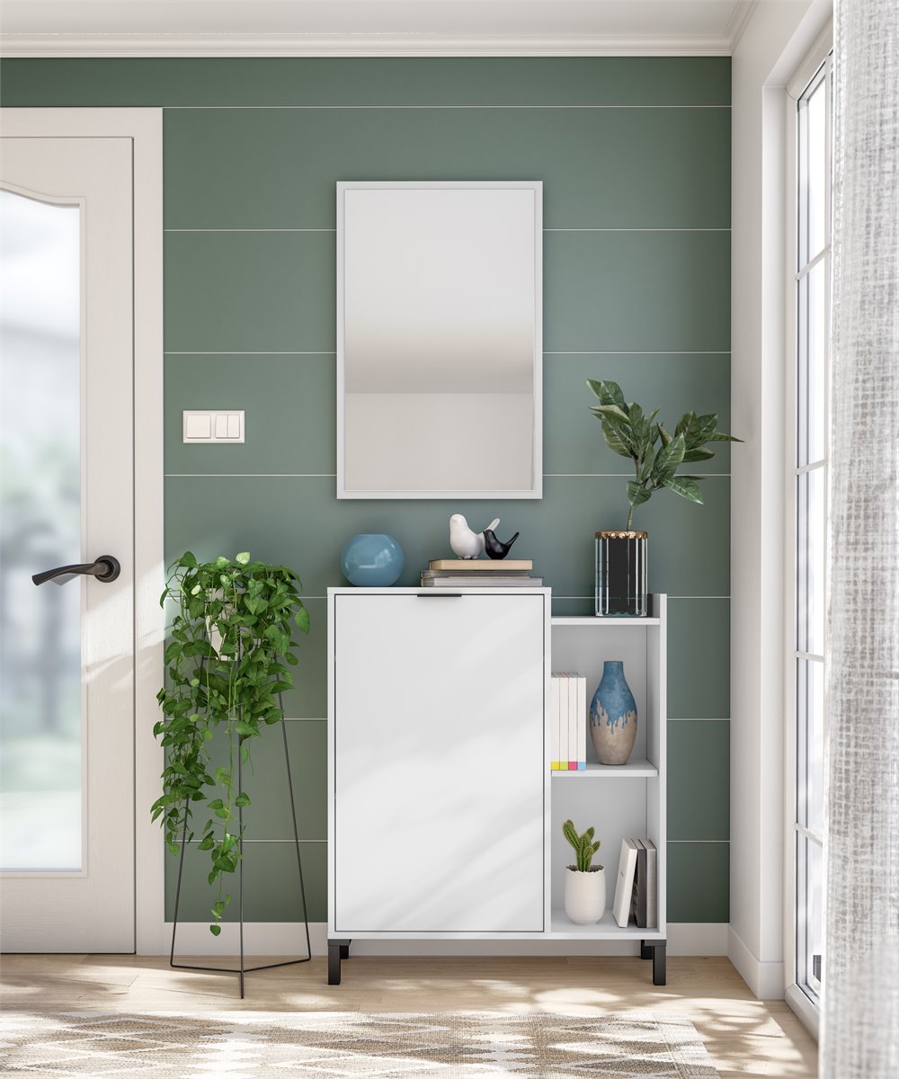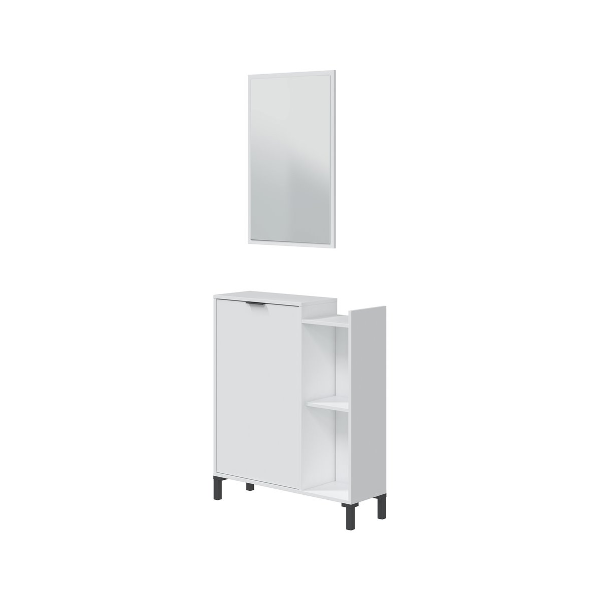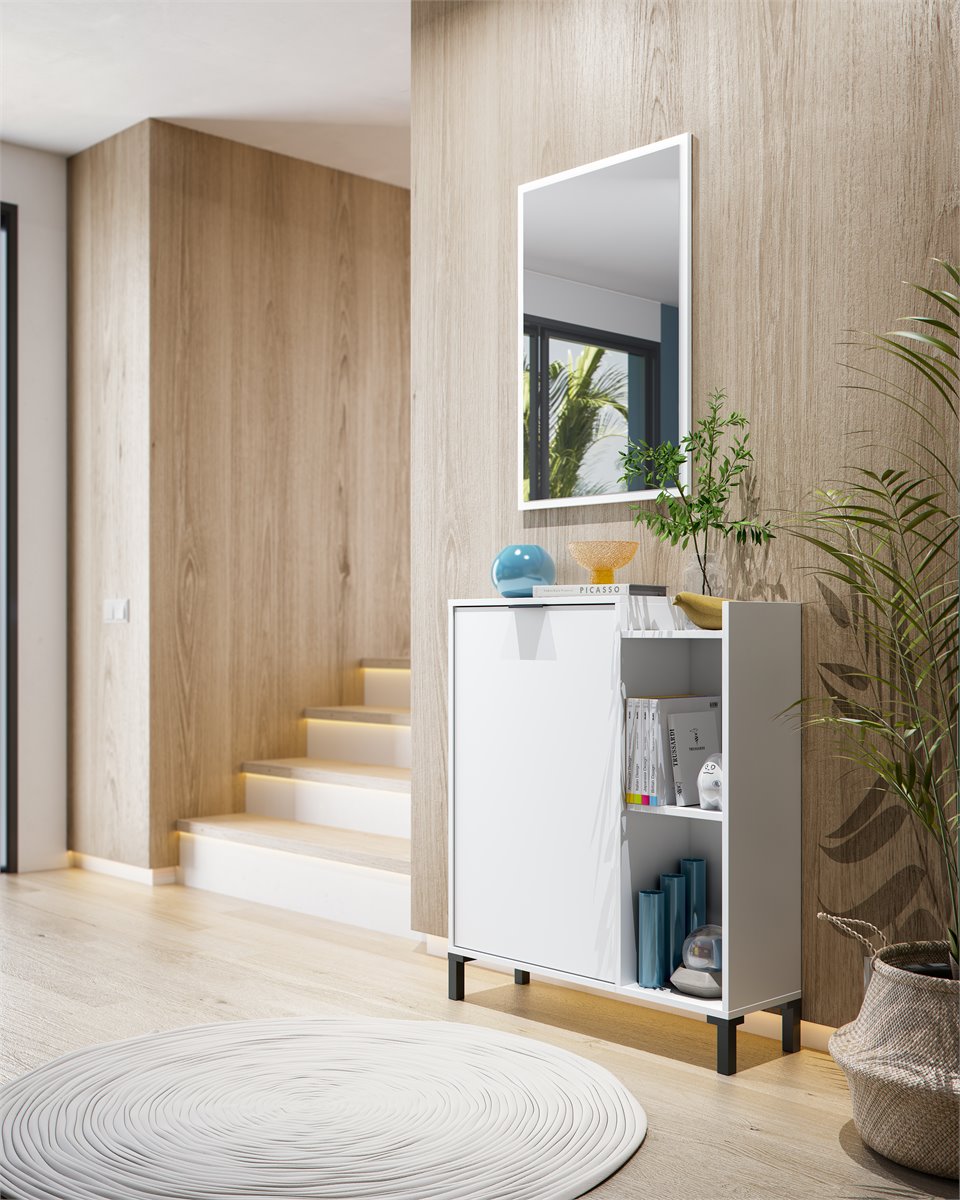 Bienvenido a tu nuevo recibidor de ensueño HELLO. Este increíble mueble cuenta con un espejo blanco mate de 77x50 cm que se puede colocar tanto en posición horizontal como vertical, adaptándose perfectamente a tu espacio. Con su puerta, dos estantes interiores y dos estantes exteriores, tendrás espacio más que suficiente para organizar tus objetos personales. Además, su tirador de aluminio negro y bisagras metálicas le dan un toque moderno y resistente. Completa con patas ABS negro para mayor estabilidad.