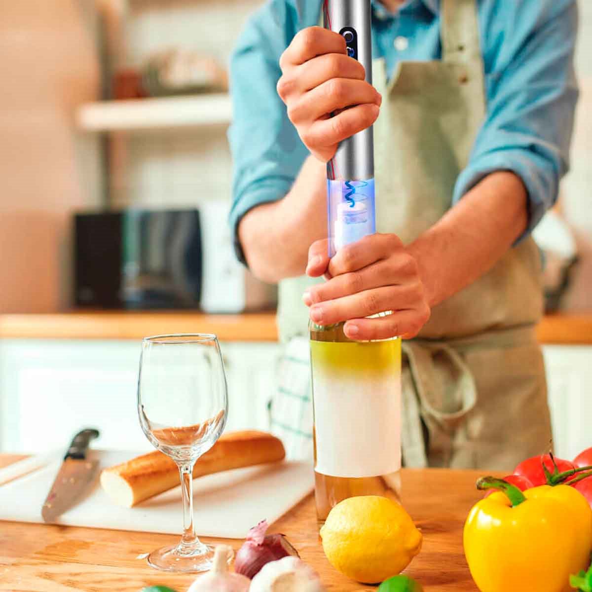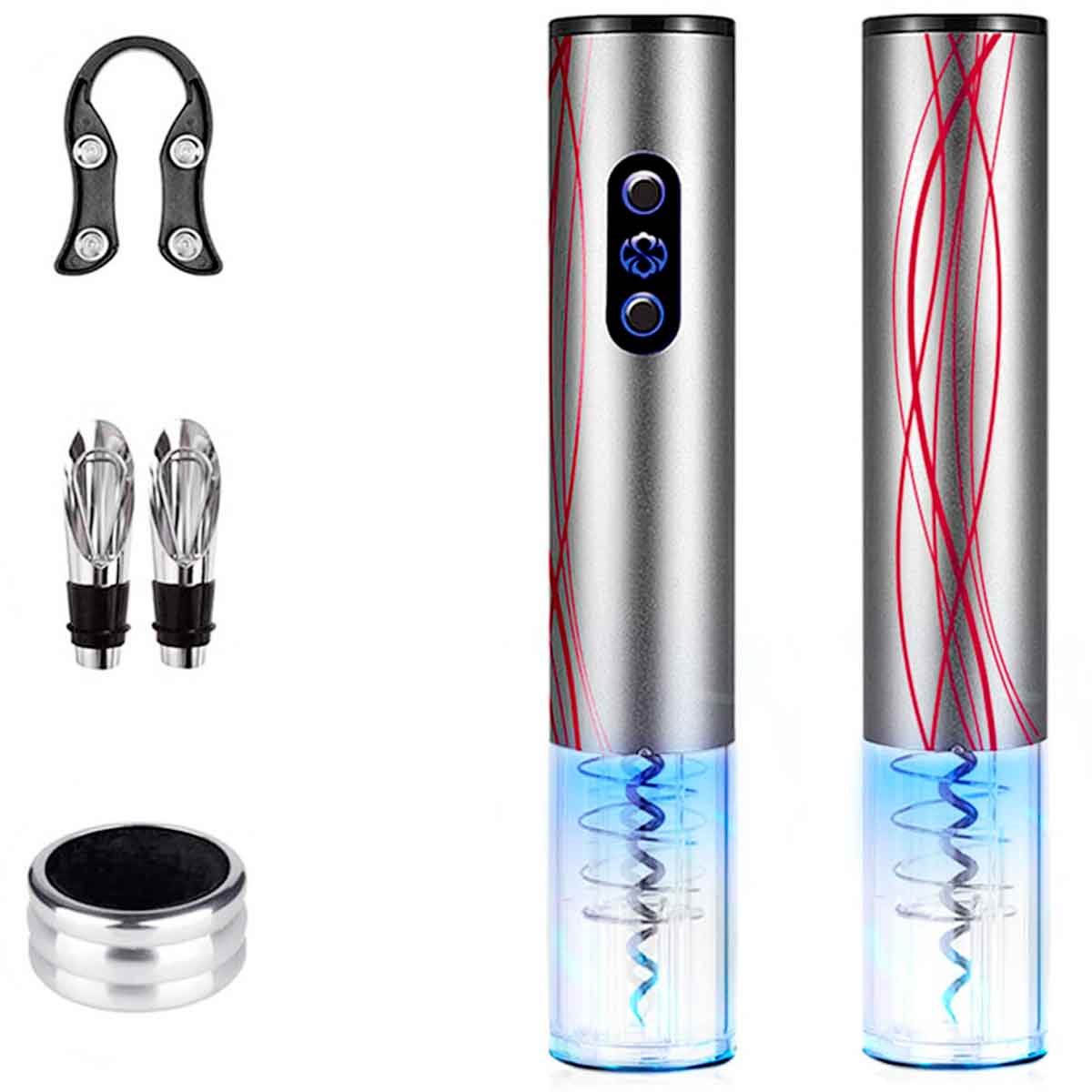 SILVER-LUX de la marca española Gridinlux es el sacacorchos eléctrico perfecto para tus mejores veladas. Elegancia y tecnología en la mesa. Descorcharás tus mejores botellas en tan solo unos segundos. EL KIT INCLUYE: SACACORCHOS ELÉCTRICO + 2 ESCANCIADORES CON TAPÓN: al escanciar evitaremos las molestas manchas y con el tapón conservaremos mejor el vino + 1 CORTACÁPSULAS: para realizar un corte preciso y limpio por debajo del gollete y evitar contaminar el vino con restos de la cápsula + 1 ANILLO ANTI-GOTEO: se introduce en el cuello de la botella y corta el flujo del vino evitando que se derramen evitando incómodas manchas. Podrás abrir sin esfuerzo botellas de vino, espumosos… y extraer corchos de todo tipo de material: corcho natural, aglomerado, sintético…Sencillo e intuitivo gracias a sus dos botones: Usa un botón para extraer el corcho de la botella y el otro botón para liberarlo y dejarlo listo para el próximo uso. Además incluye LUZ LED para un uso seguro y preciso, que a la vez le aporta distinción y elegancia. SILVER-LUX es manejable y ligero. Es espectacular y tiene el tamaño ideal para tenerlo a mano en tu salón o cocina hasta la próxima velada. Fabricado con los mejores materiales, que aseguran la durabilidad y el funcionamiento óptimo del dispositivo. Aporta elegancia en la mesa. Conviértete en un gran sumiller. Ahorra tiempo y queda fenomenal delante de tus invitados usando el elegante descorchador eléctrico SILVER-LUX. Regalo ideal: amigo invisible, navidades, cumpleaños. Regala distinción. Respetuosa con el medio ambiente y fabricado con la más Alta calidad de materiales. Garantía Internacional. GridinLux sólo trabaja con PRODUCTOS CERTIFICADOS. DATOS TÉCNICOS: Potencia: 5 W Voltaje: 6 V (4 pilas AA no incluidas) Ruido: <75 dB Peso: 300 gMedidas: 25,2 x 4,5 cm Medidas: caja 7 x 7 x 27 cm Accesorios: 1 Cortacápsulas, 1 Anillo antigoteo, 2 Escanciadores.