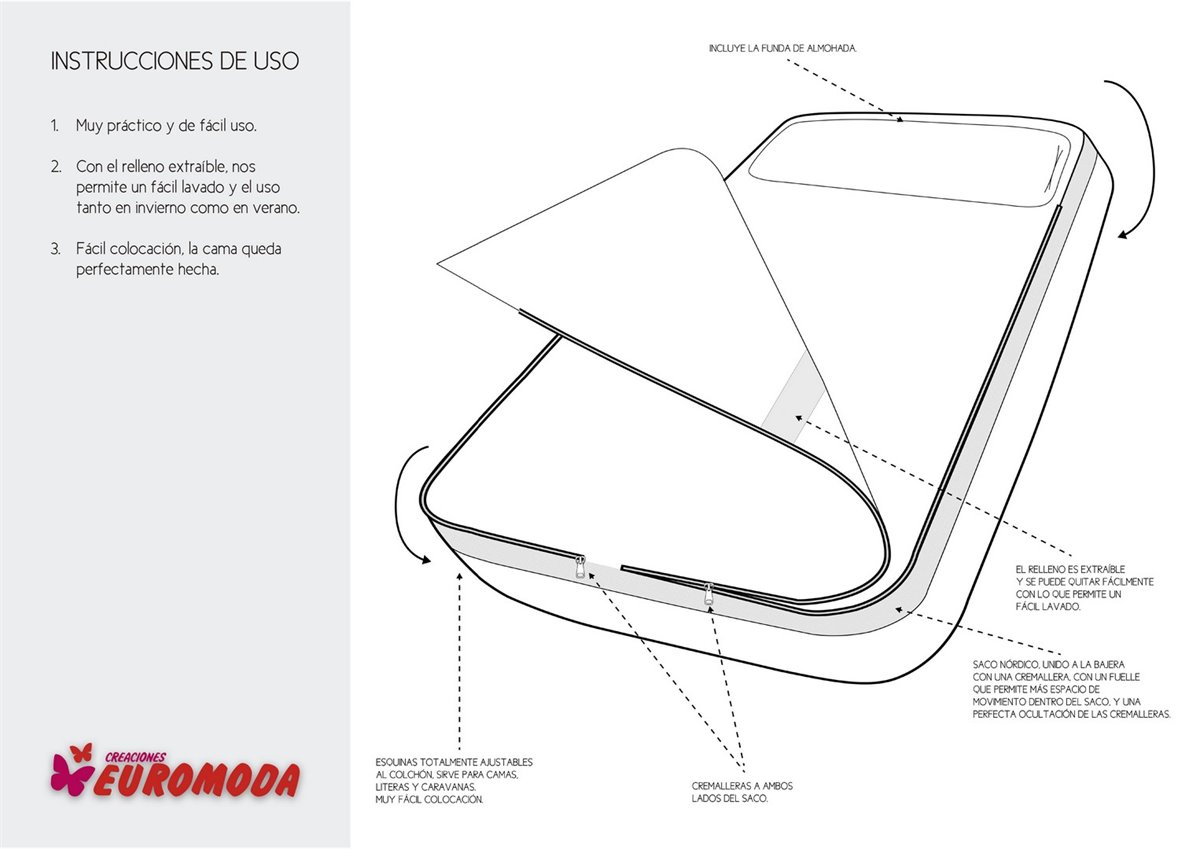 El saco nórdico, va unido a la bajera con una cremallera por ambos lados, con un fuelle donde permite más espacio de movimiento dentro del saco. El relleno no incluido se puede extraer con facilidad mediante una cremallera interior.