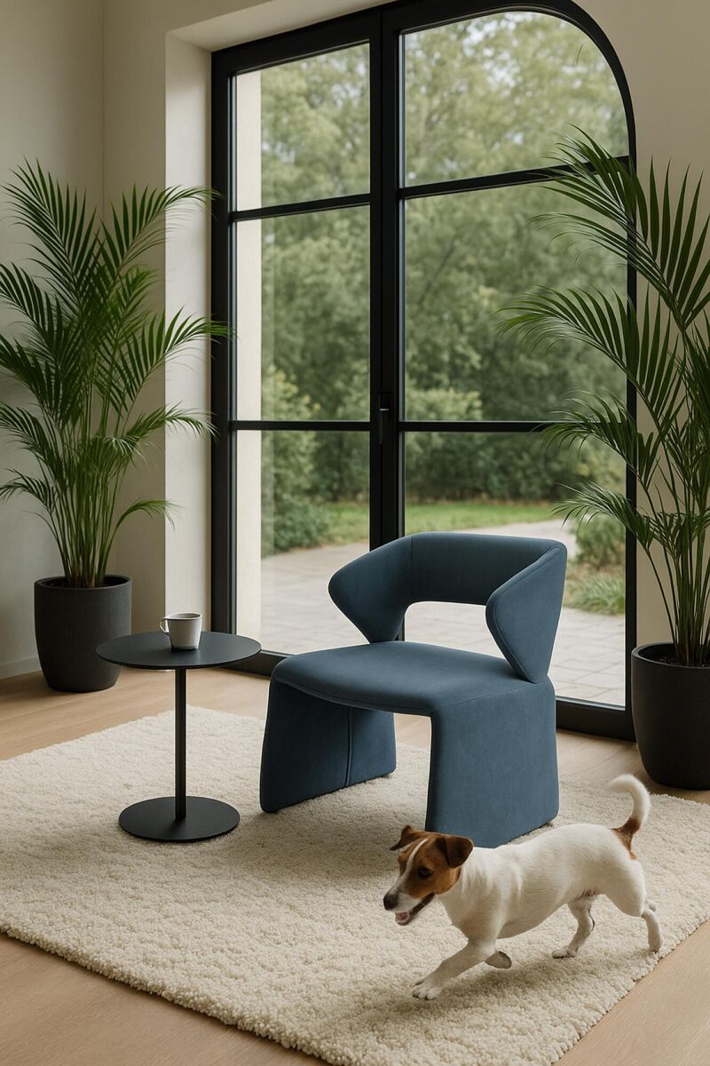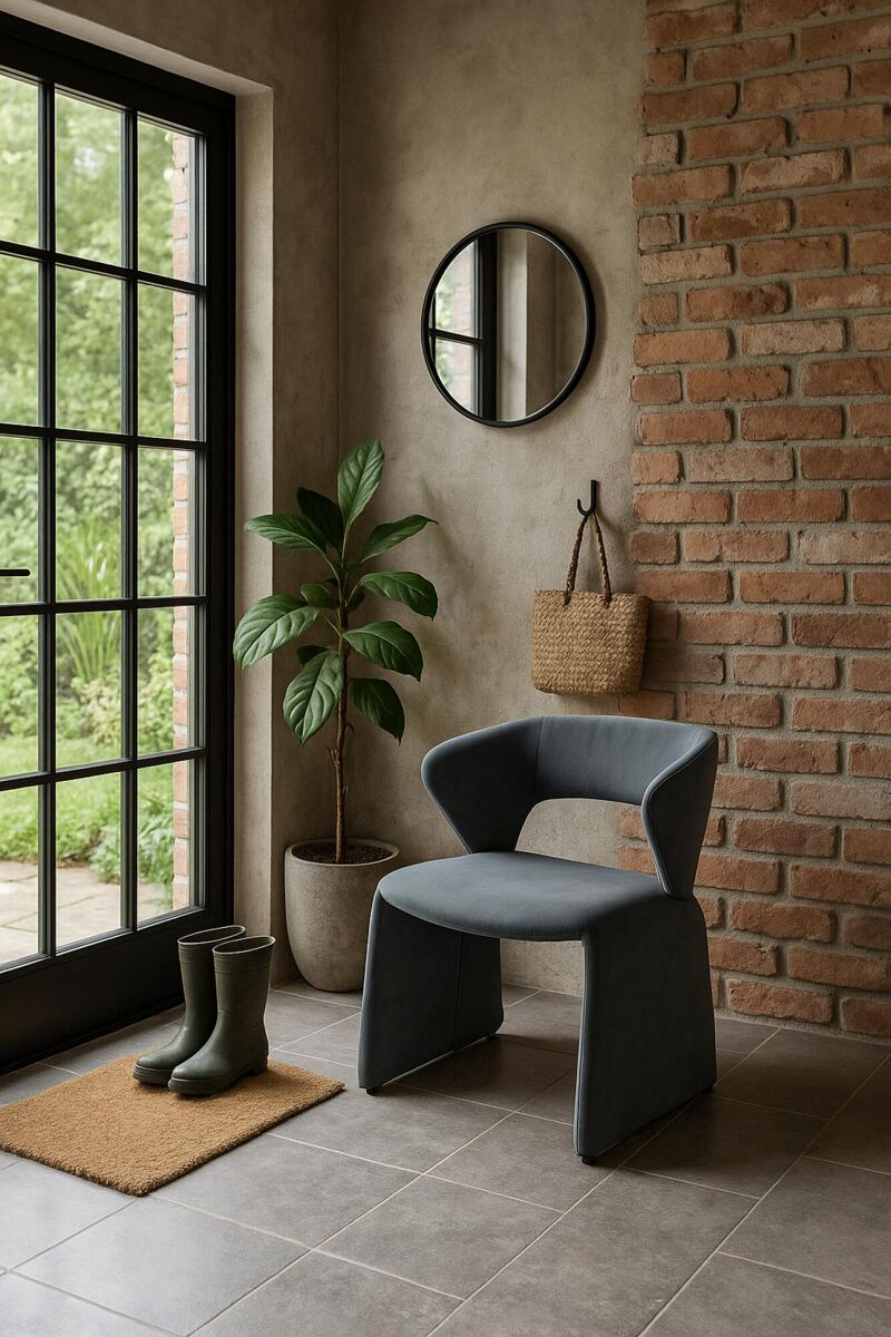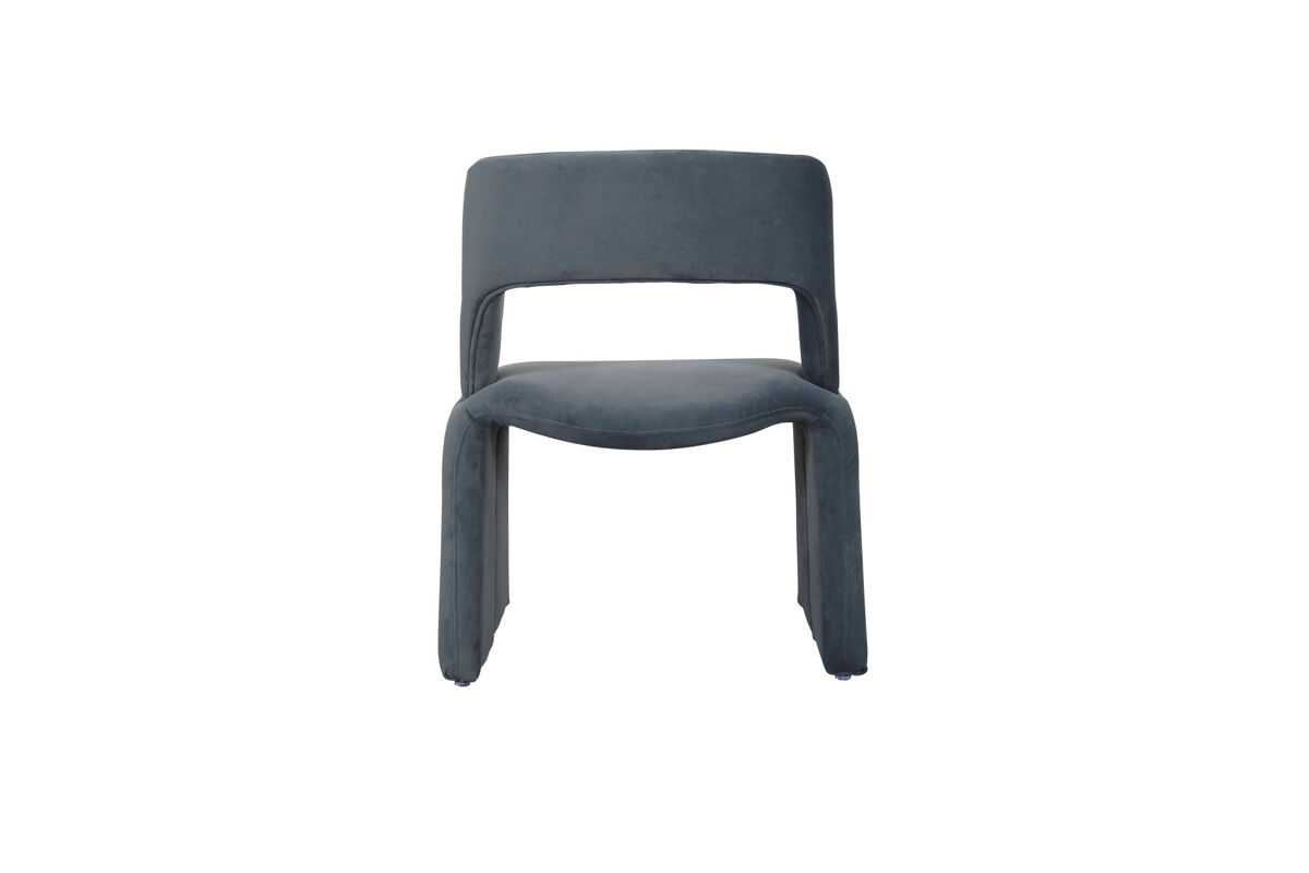 Una moderna silla tapizada en color grafito con tejido de terciopelo. Su forma minimalista y geométrica y sus cuidados acabados permiten que el producto encaje en cualquier interior.