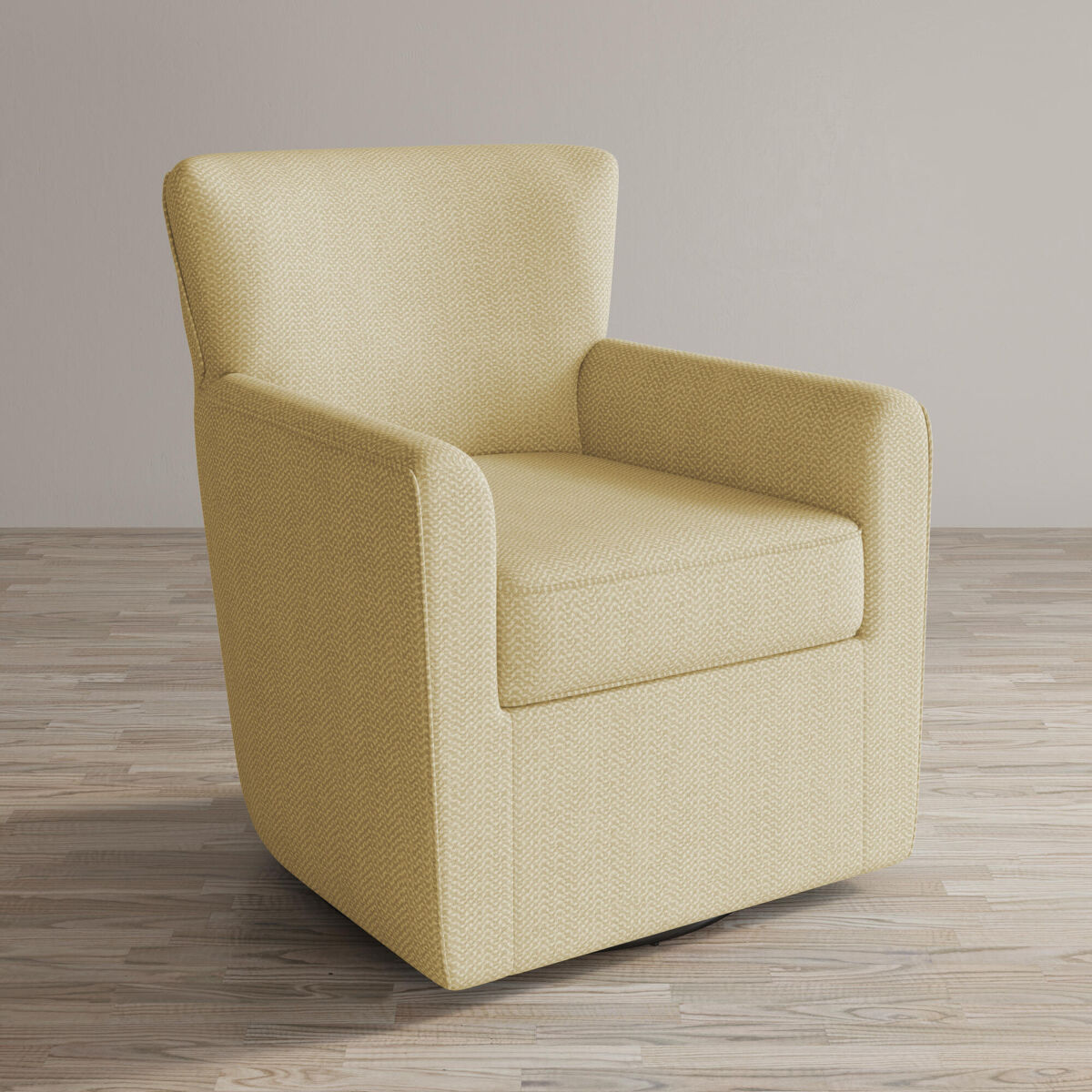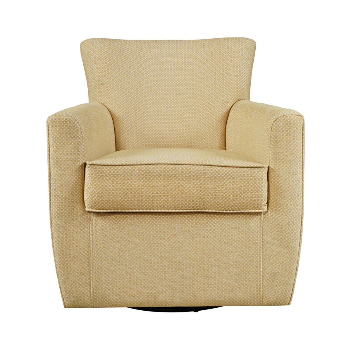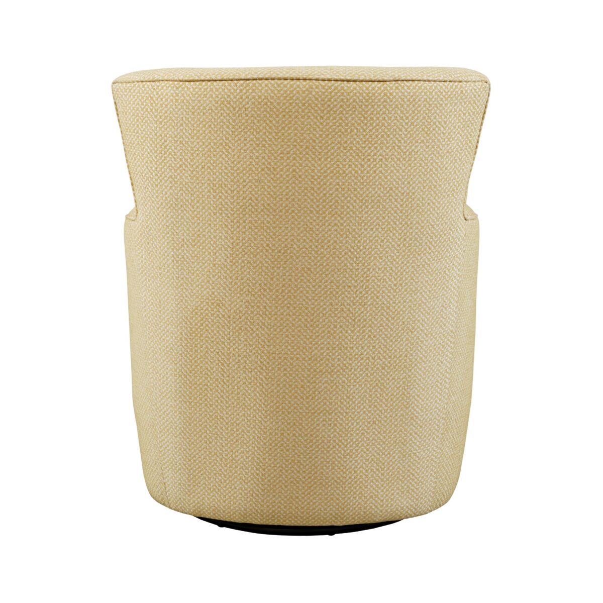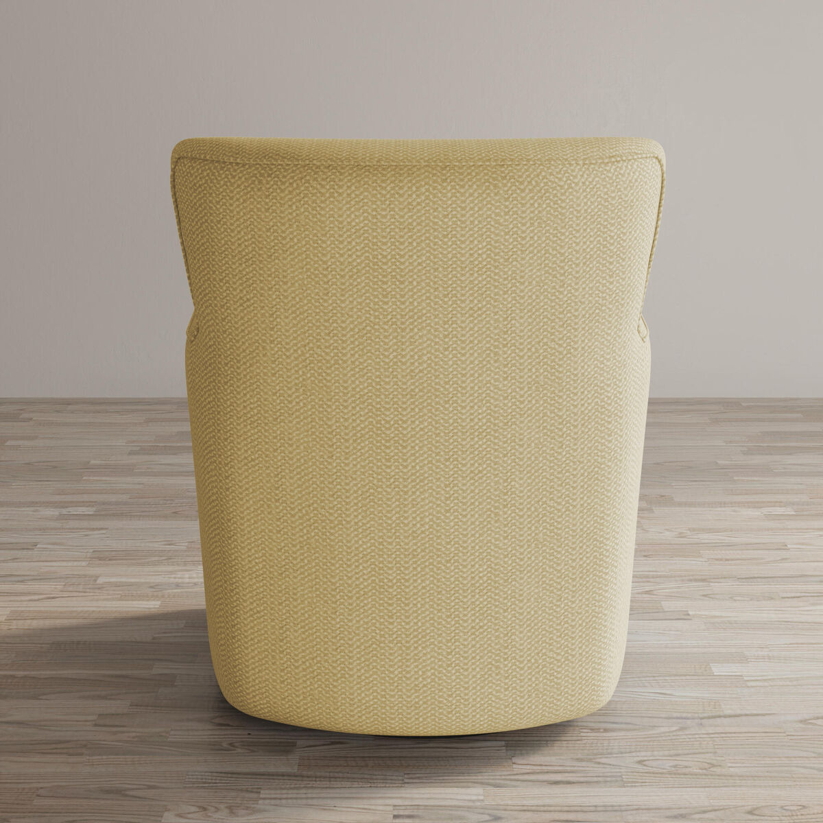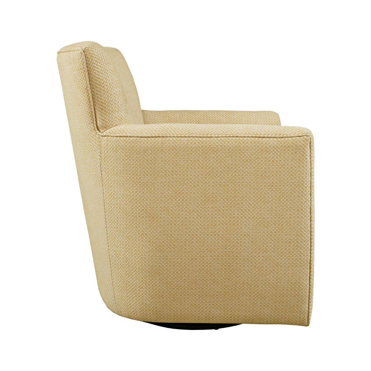Elegante sillón giratorio tapizado en color amarillo soleado, fabricado con tejido de la más alta calidad. La forma clásica del mueble, basada en las formas redondeadas de moda, enriquecerá cualquier salón.