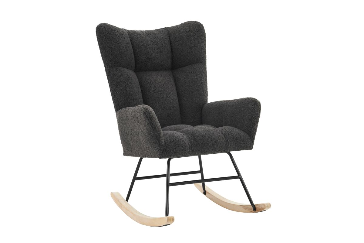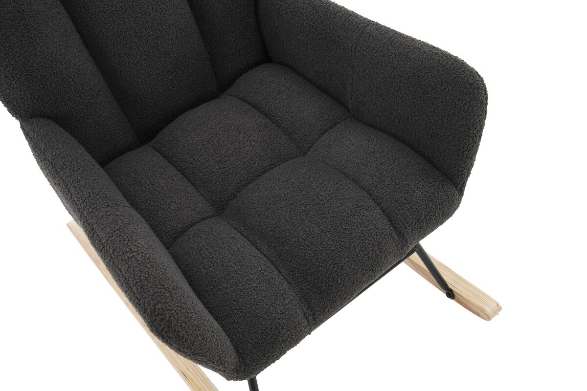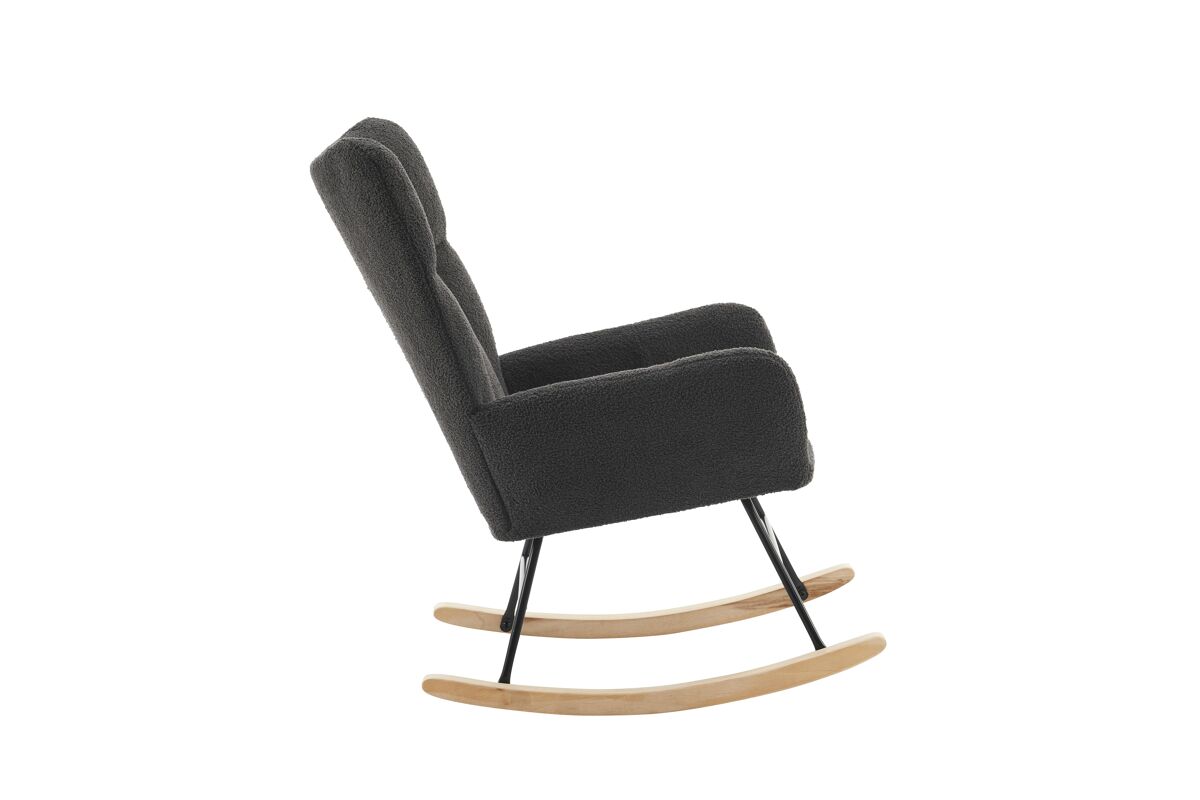 - Silla mecedora moderna con respaldo alto y reposabrazos, diseñada para ofrecer comodidad y soporte ergonómico.