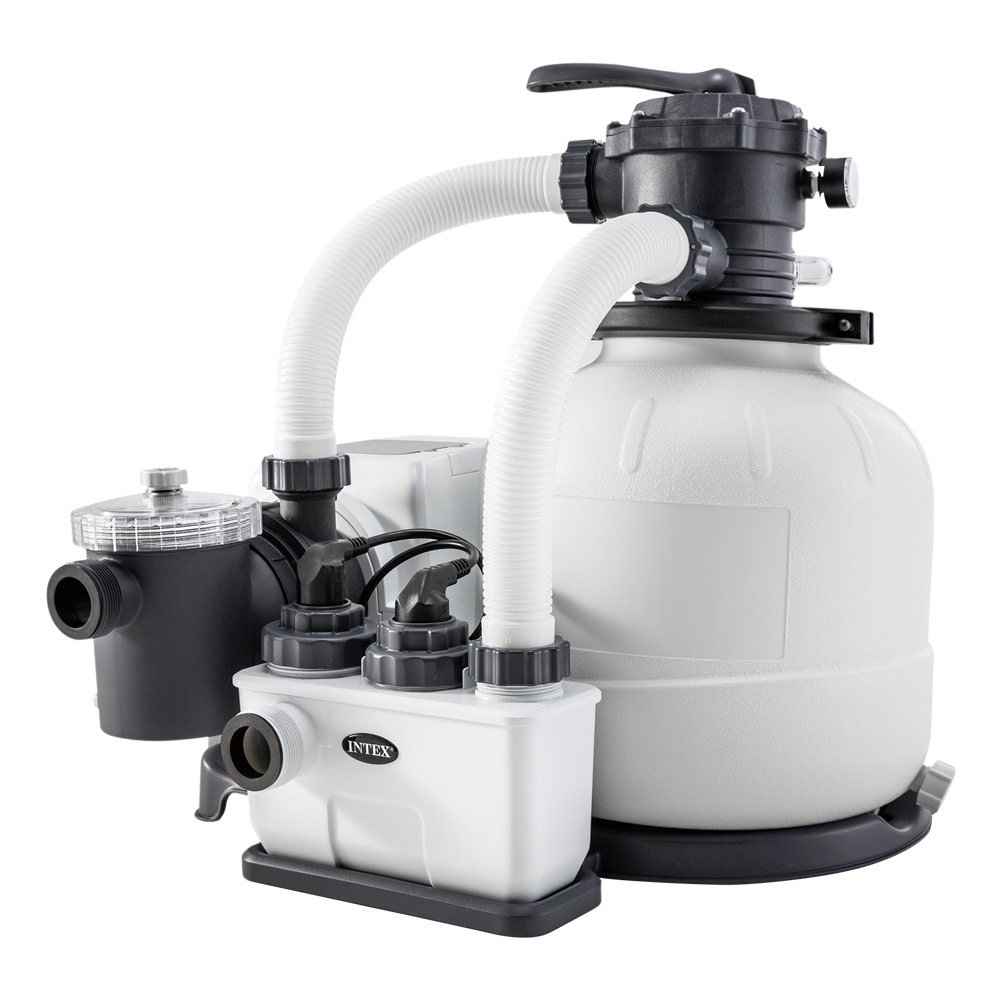 - Sistema de depuración INTEX, combina cloración salina y filtración por arena, indicado para piscinas elevadas de hasta 32.200 litros, potencia motor 0,3 hp