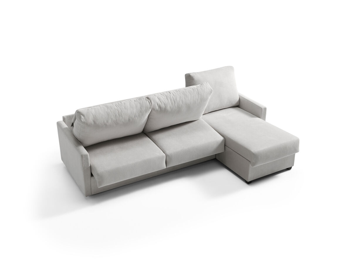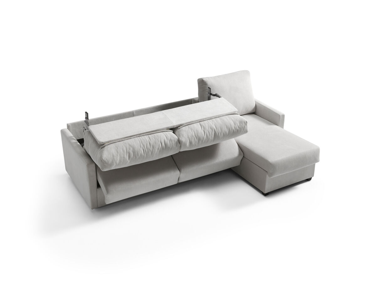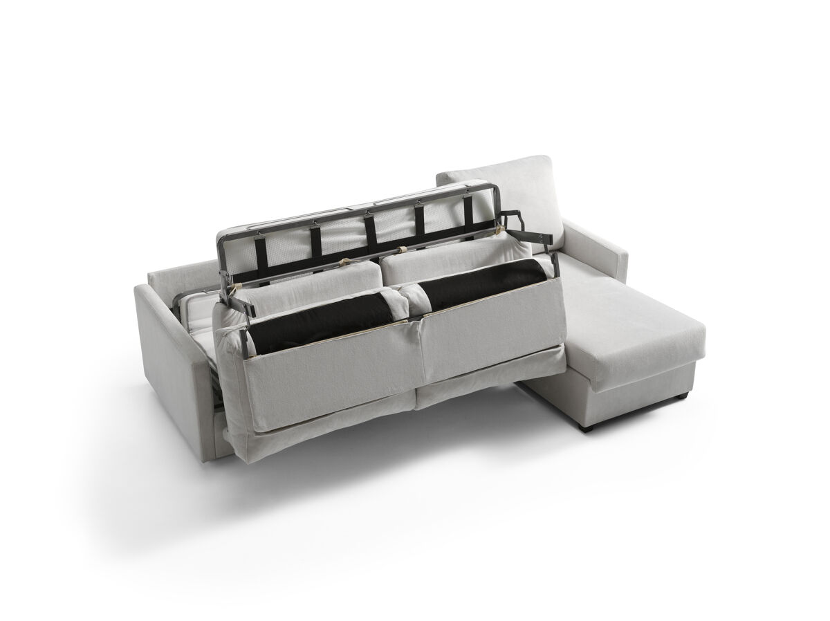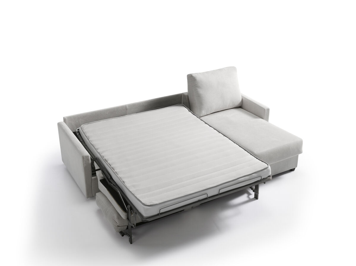 Estructura en madera maciza y tablero de partículas. Bastidor de madera y nea. Relleno de asientos goma de 27 kg. Relleno de respaldo con fibra hueca 100%. Patas PVC wengue. Almohadas desenfundables. Cama sistema apertura italiana. Colchón de 140 cms.