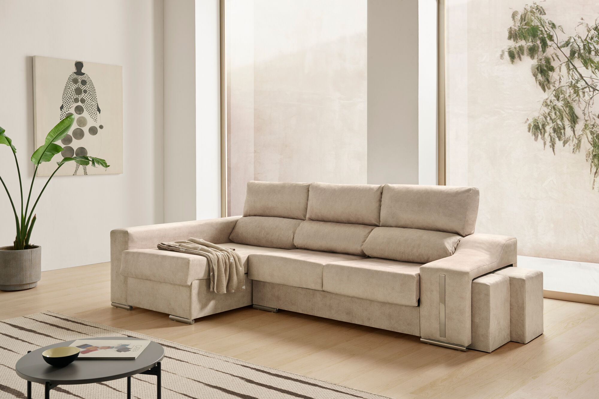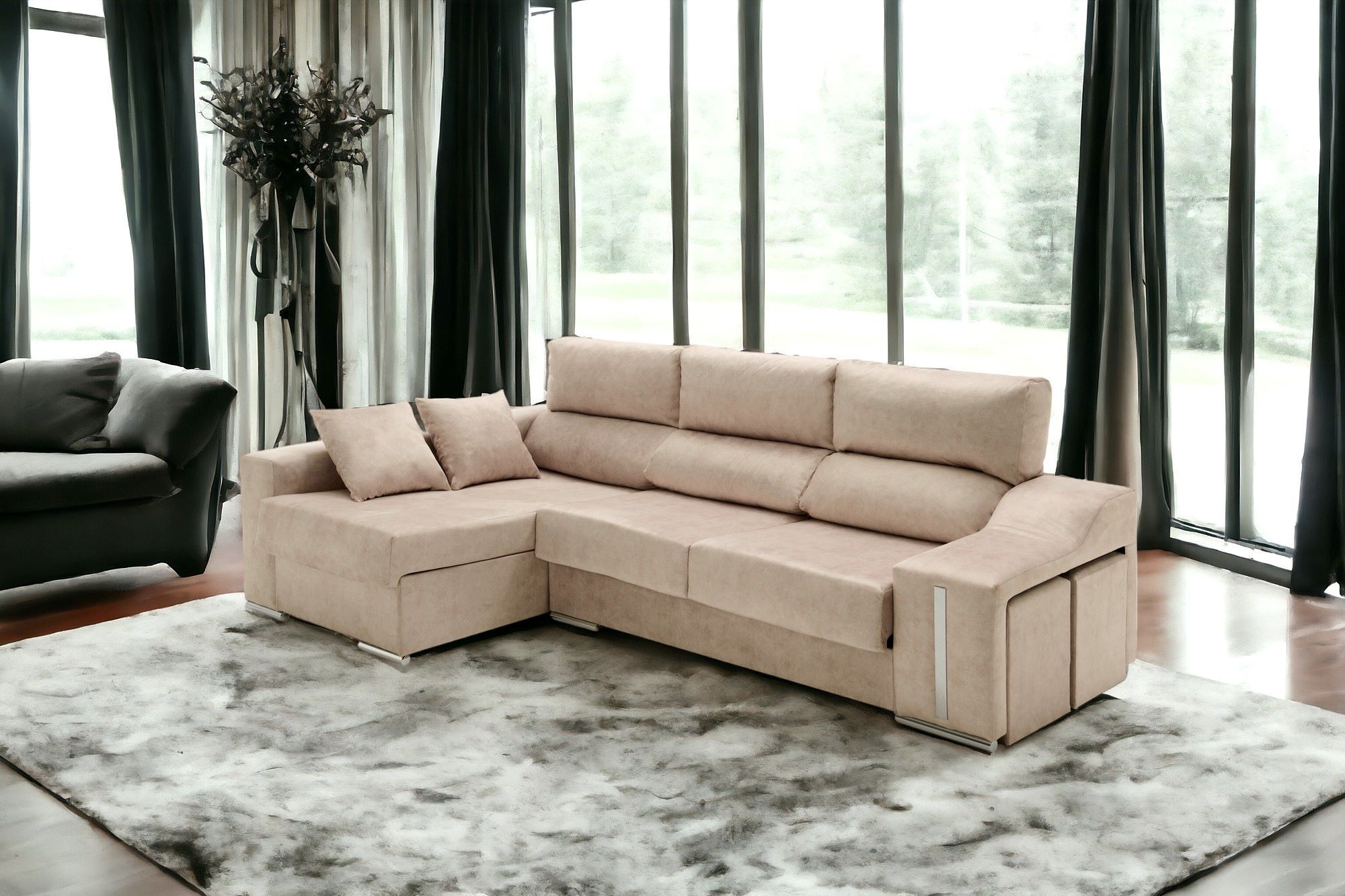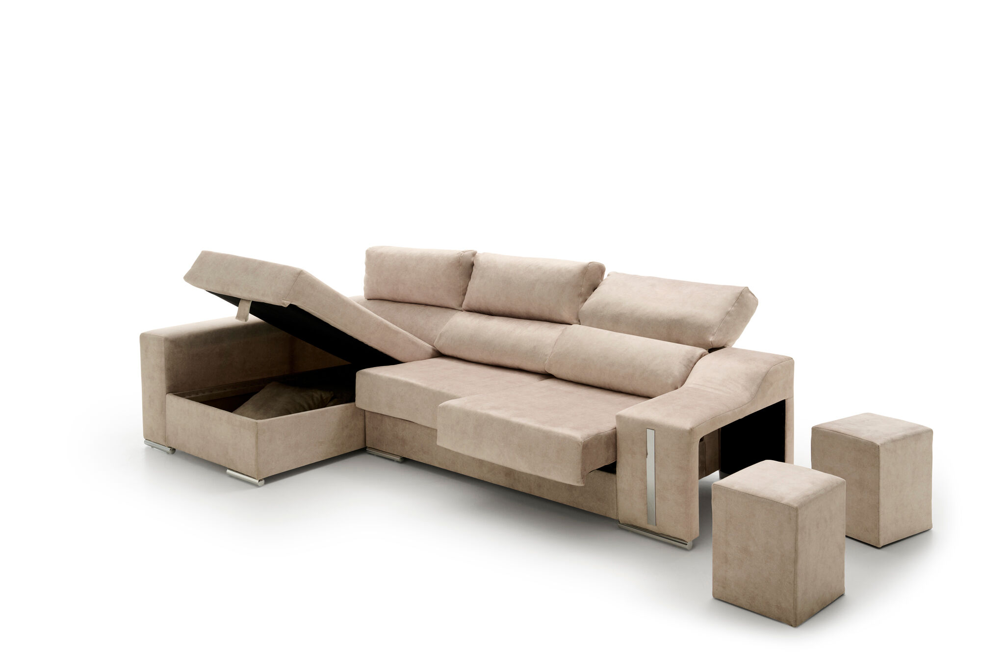 Sofa chaise longue reclinable y deslizante con pufs Serena