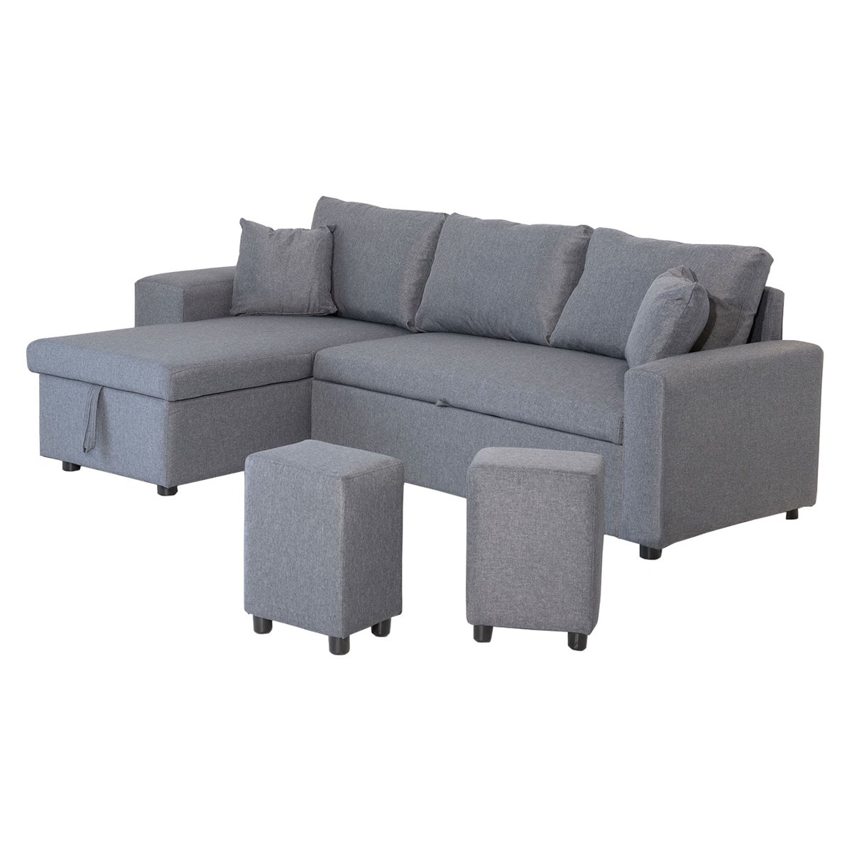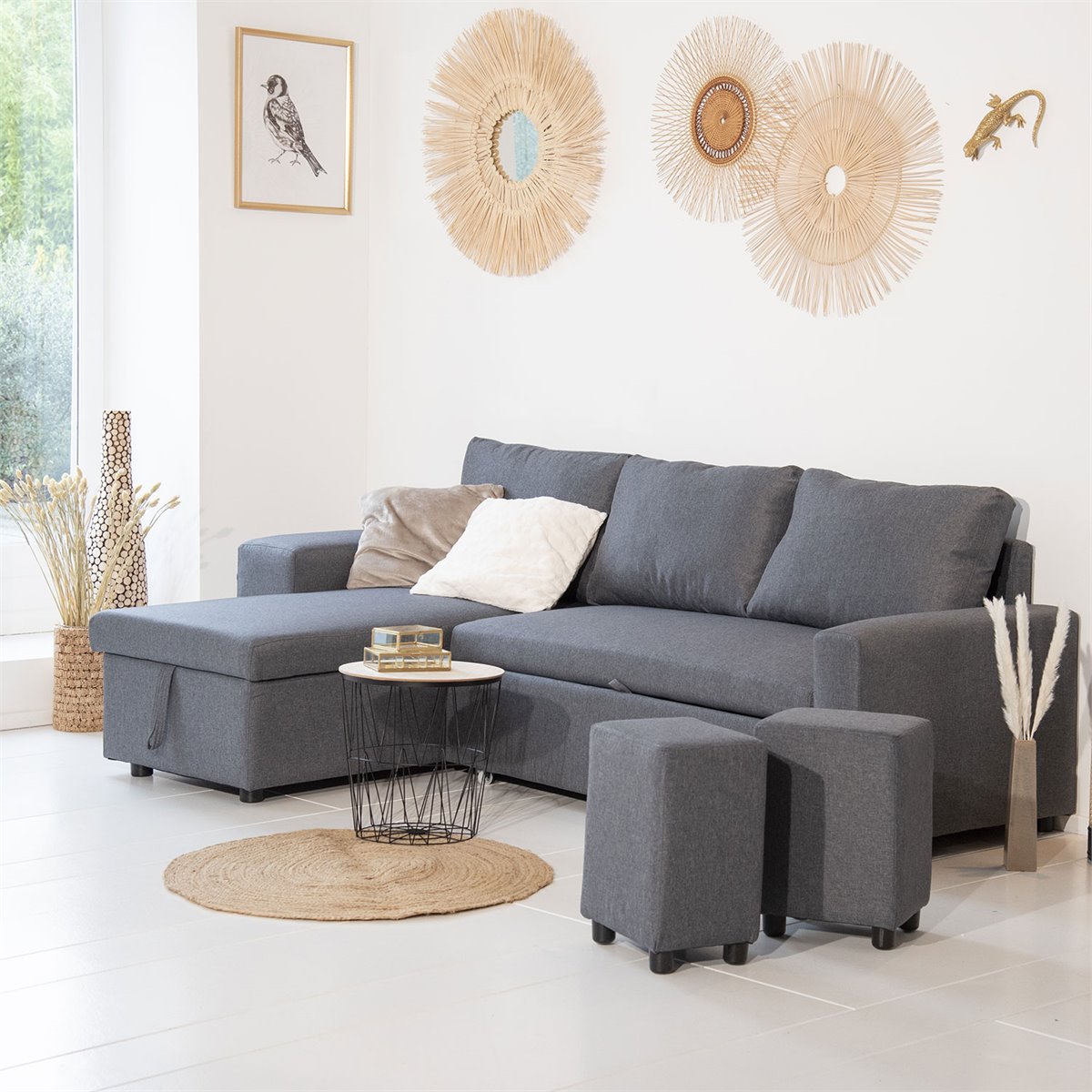 Optimice su espacio con el sofá cama esquinero TONY. Su sofá cama reversible y sus reposapiés adicionales bajo el reposabrazos le permitirán organizar fácilmente su habitación. En un abrir y cerrar de ojos, puede cambiar al modo de dormir gracias a un sencillo sistema de cajones que transforma su sofá en una cama doble muy cómoda. Debajo del sofá hay un amplio espacio para guardar sábanas, almohadas y edredones. El sofá cama TONY es tan cómodo como moderno gracias a su diseño limpio y a sus modernos colores que combinan con cualquier decoración.