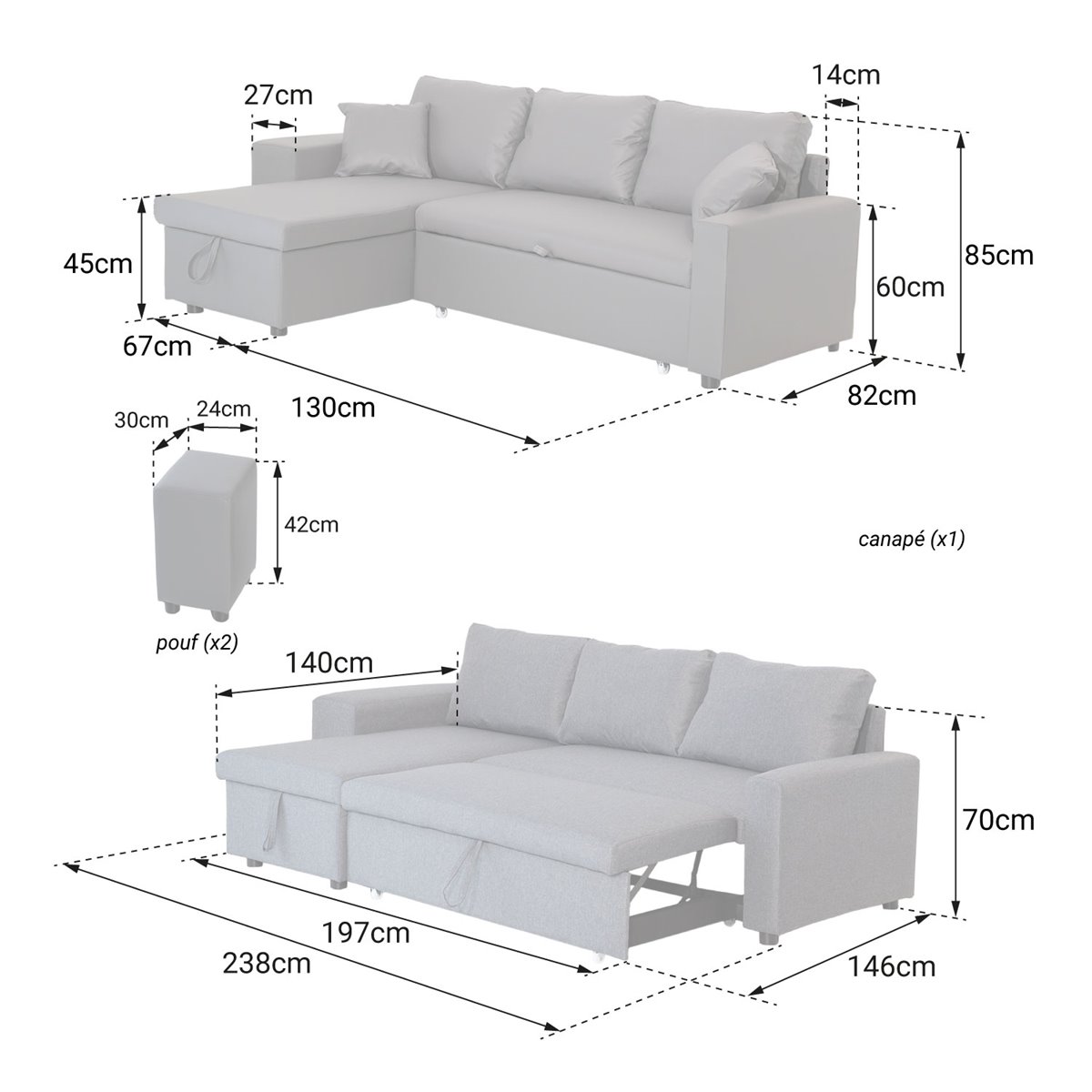 - Sofá: L 238 × An 146 × Al 85cm