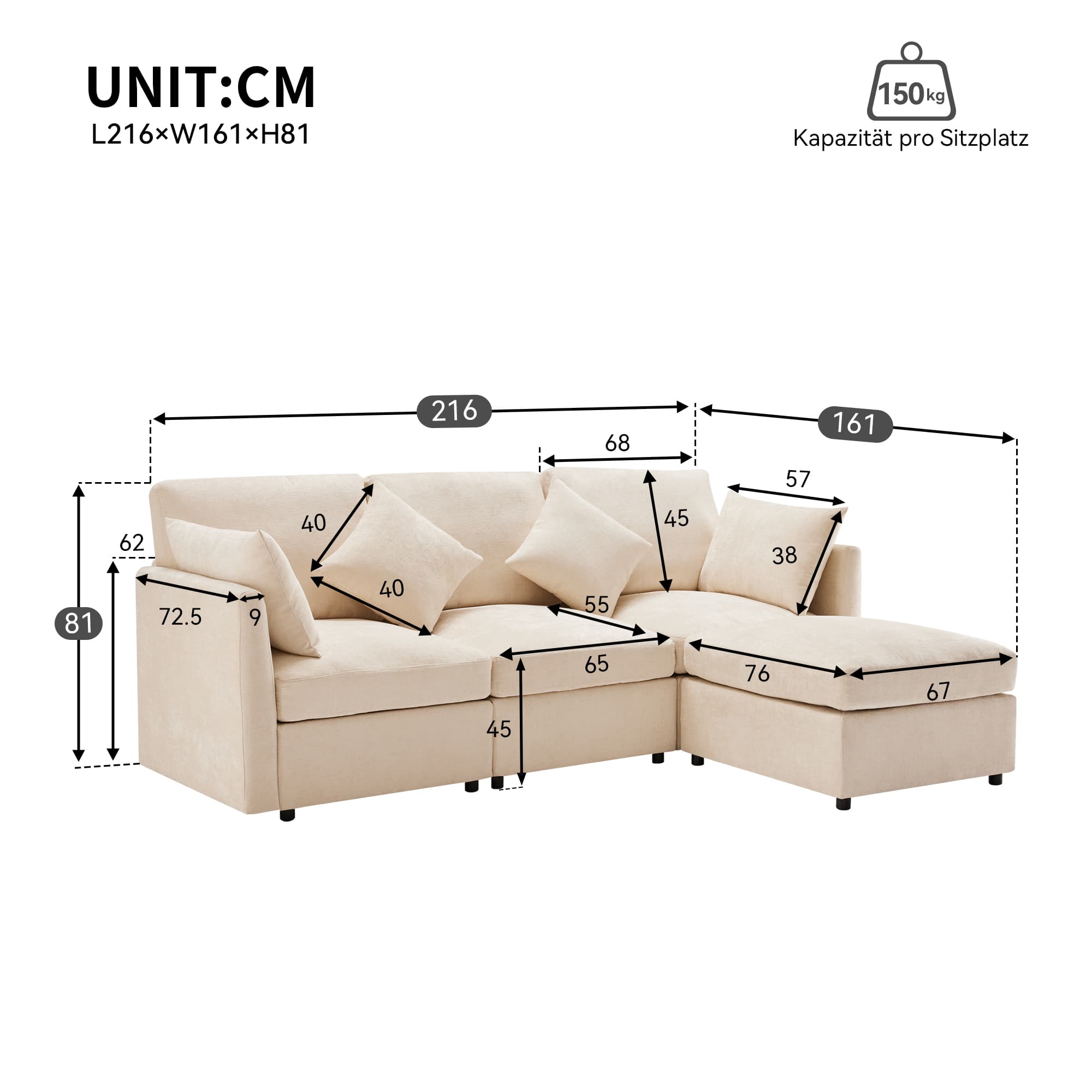 - Tamaño total del sofá: 216 x 161 x 81 cm