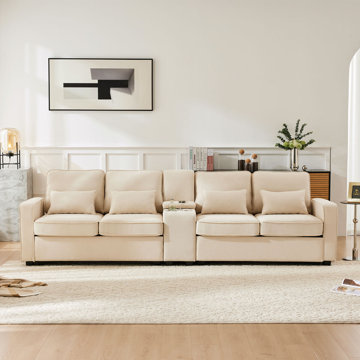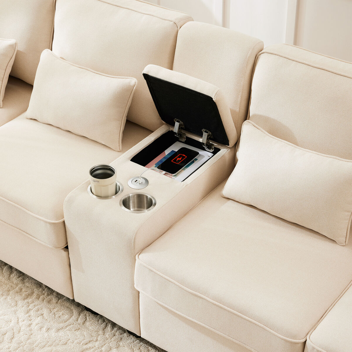 Equipado con una interfaz USB para conectar dispositivos electrónicos con cable y equipado con 2 portavasos para colocar cómodamente vasos de agua o bebidas. También está equipado con gabinetes de almacenamiento para facilitar el acceso a los artículos, lo que hace que el sofá esté más ordenado.