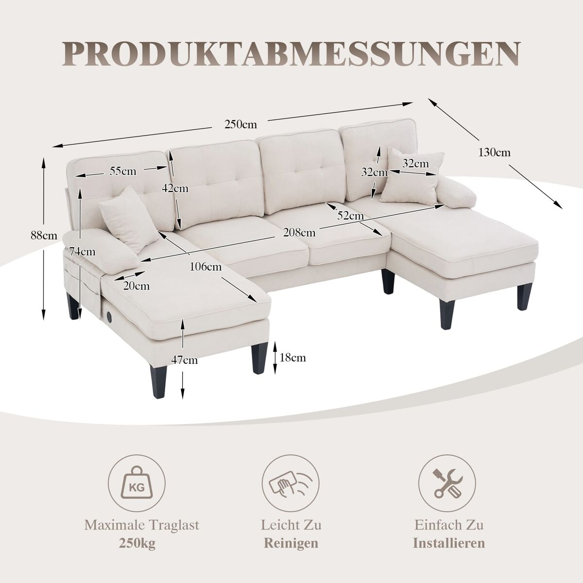 - Dimensiones: 250 × 130 × 88 cm