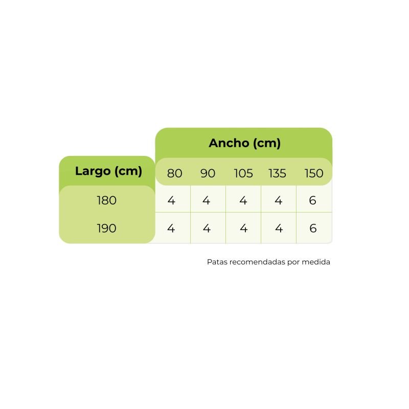 Al seleccionar la opción con patas, el somier se entregará con el número de patas recomendado por medida indicado en el cuadro de información y requerirá el montaje de estas. Si, por lo contrario, optas por la opción sin patas, en el mismo cuadro de información, encontrarás la cantidad recomendada a escoger.