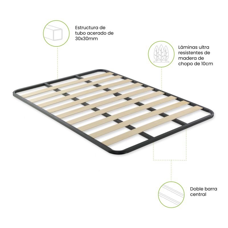 - Tubo acerado 30x30mm: La estructura del somier está compuesta por un robusto tubo acerado de 30x30mm que garantiza la estabilidad y durabilidad del somier.