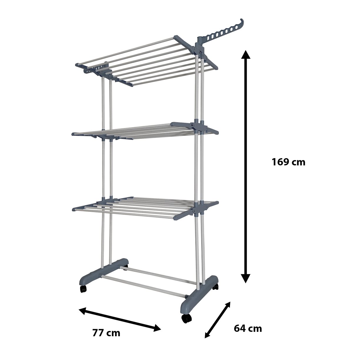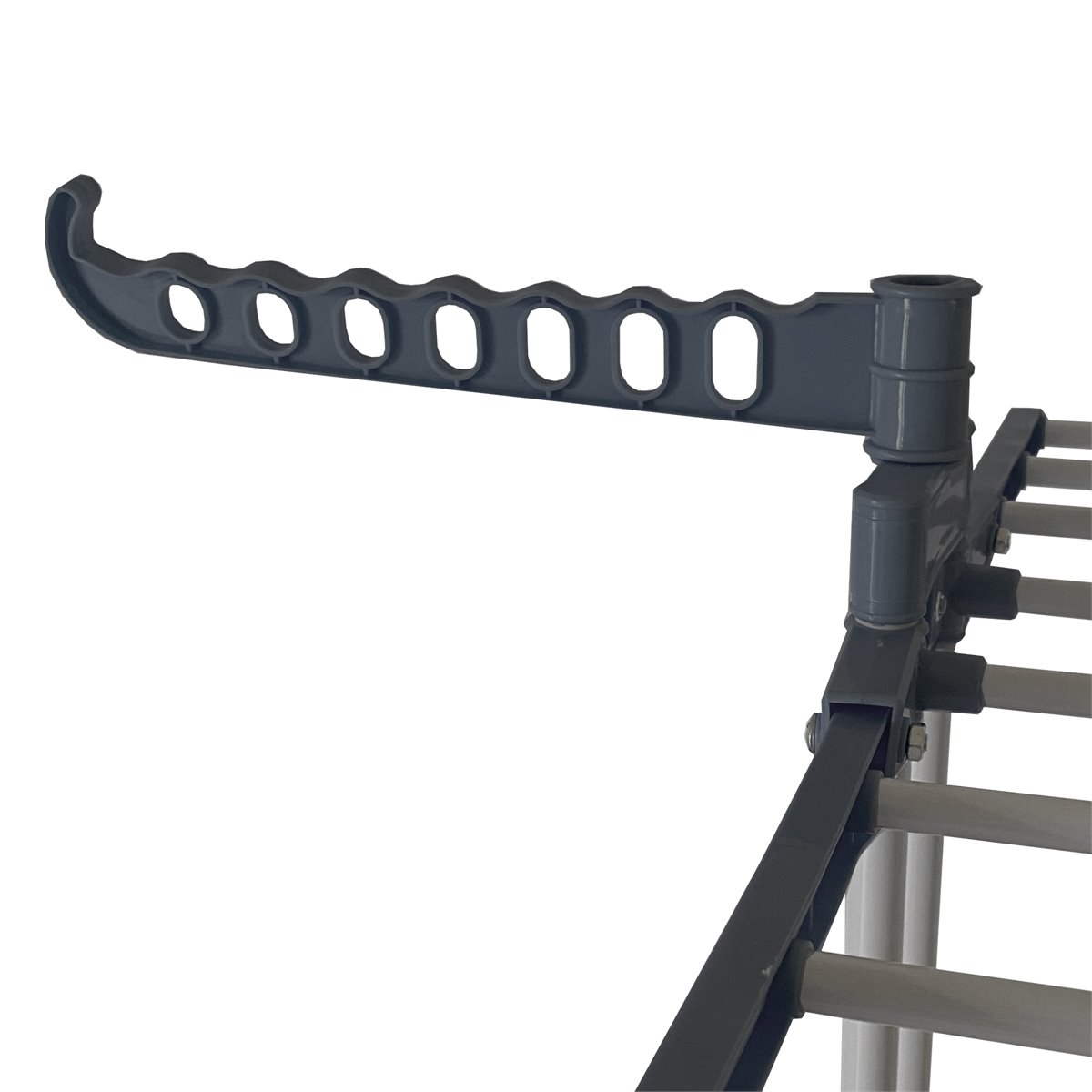 El tendedero tiene 4 niveles y 180cm de altura. Consta de 6 lados plegables para el secado de toallas, calcetines, ropa, zapatos, edredones, etc. y 2 lados giratorios con 14 ganchos para el secado colgante adicional.