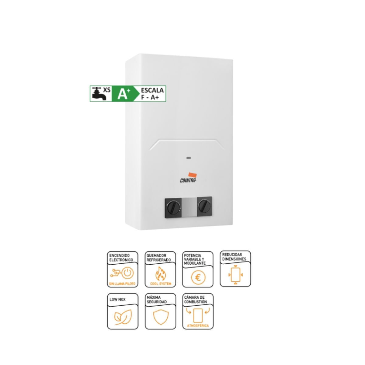 El calentador de gas Cointra Cami6B es la solución práctica y eficiente para disponer de agua caliente en casa con total comodidad y seguridad. Funciona con gas butano y cuenta con una cámara de combustión atmosférica, garantizando un rendimiento fiable en todo momento. Su capacidad de 6 litros lo convierte en un modelo ideal para viviendas que buscan cubrir sus necesidades diarias de agua caliente de manera sencilla. Dispone de encendido electrónico por baterías, lo que elimina la necesidad de llama piloto permanente y supone un ahorro adicional. Además, ofrece una potencia variable y modulable, adaptándose a cada situación para optimizar el consumo y reducir el gasto energético. Con su quemador refrigerado y sistema Low NOx, este calentador consigue mayor eficiencia y respeto por el medio ambiente.