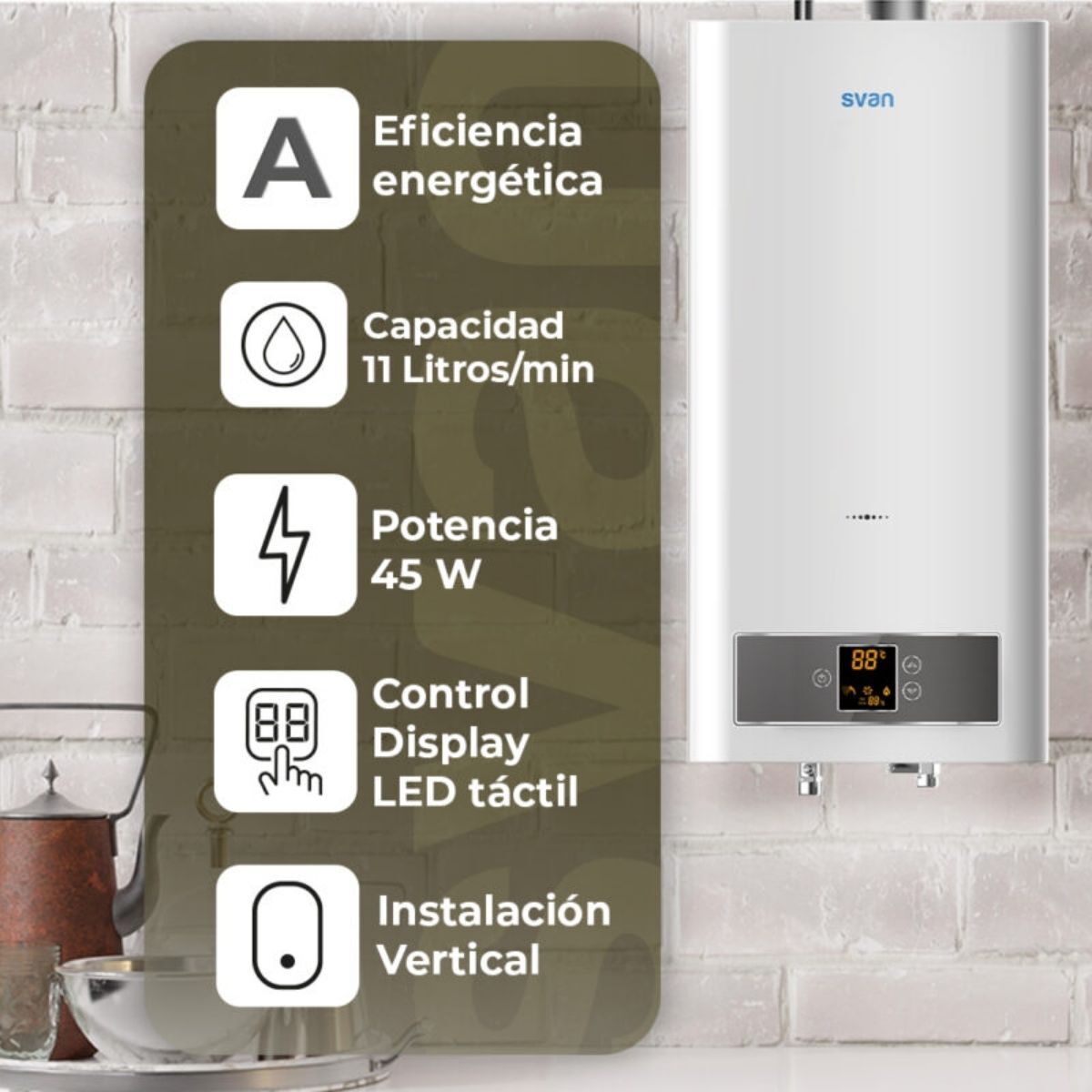 El termo de gas Svan modelo SCE1100ADB es una solución moderna y eficiente para disfrutar de agua caliente siempre que la necesites. Con instalación vertical y capacidad de 11L/min, es perfecto para cubrir las demandas diarias de tu hogar de manera cómoda y constante. Funciona con gas butano y cuenta con baja emisión de gases NOx, lo que lo convierte en una opción responsable con el medio ambiente. Su diseño en color blanco con cavidad interna cromada no solo garantiza durabilidad, sino también una estética elegante que combina con cualquier espacio. Este modelo está equipado con un panel de control táctil con Display LED, fácil de usar y pensado para que ajustes la temperatura de forma precisa hasta un máximo de 65 ºC.