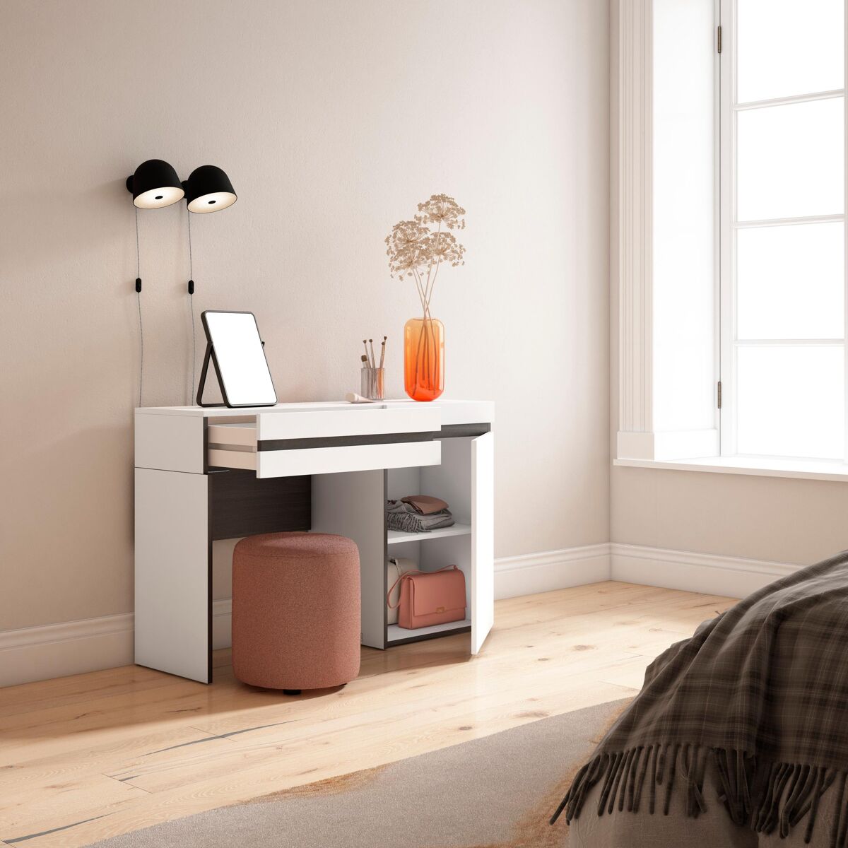 Mesa consola con espacio de almacenamiento. Se puede utilizar como tocador, escritorio, consola de entrada. El cajón multifuncional ofrece un espacio para poder guardar maquillaje, llaves u otros artículos. Medidas: 70 x 34,6 x 75 cm (Largo x Ancho x Alto). Color blanco y negro con veteado de madera de tacto poroso.