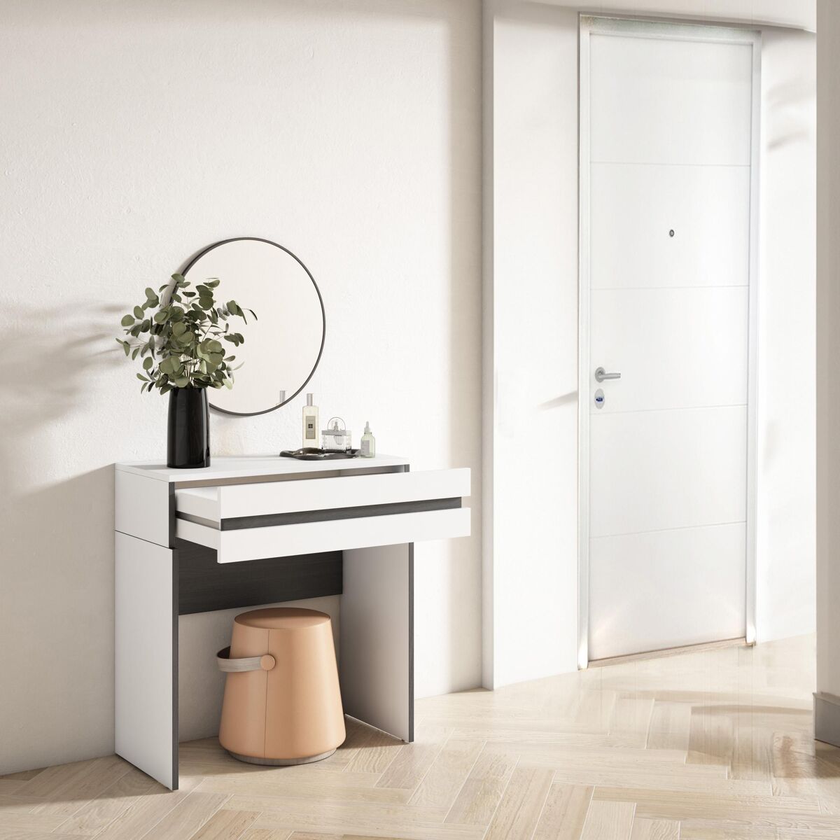 Mesa consola con espacio de almacenamiento. Se puede utilizar como tocador, escritorio, consola de entrada. El cajón multifuncional ofrece un espacio para poder guardar maquillaje, llaves u otros artículos. Medidas: 70 x 34,6 x 75 cm (Largo x Ancho x Alto). Color blanco y negro con veteado de madera de tacto poroso.