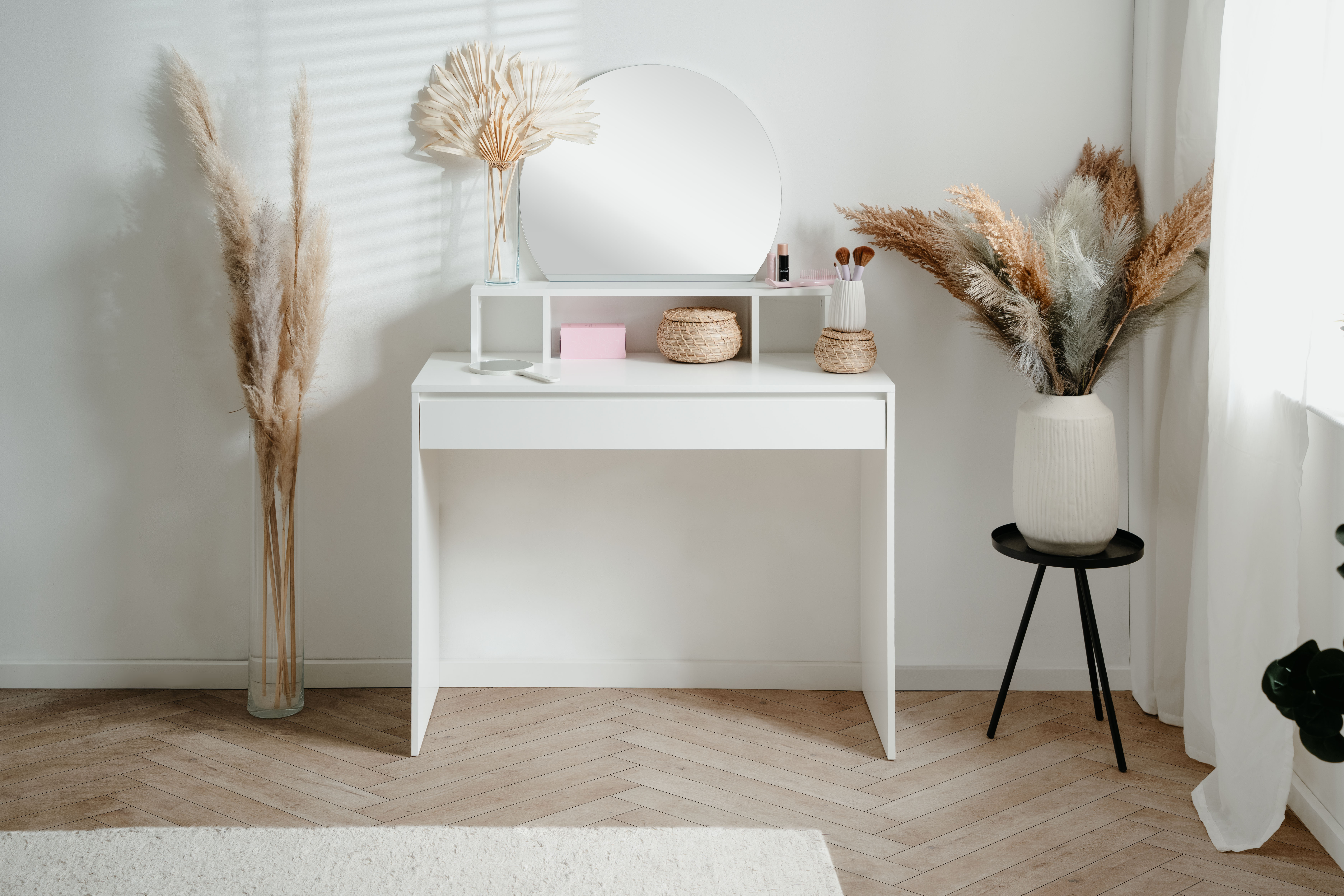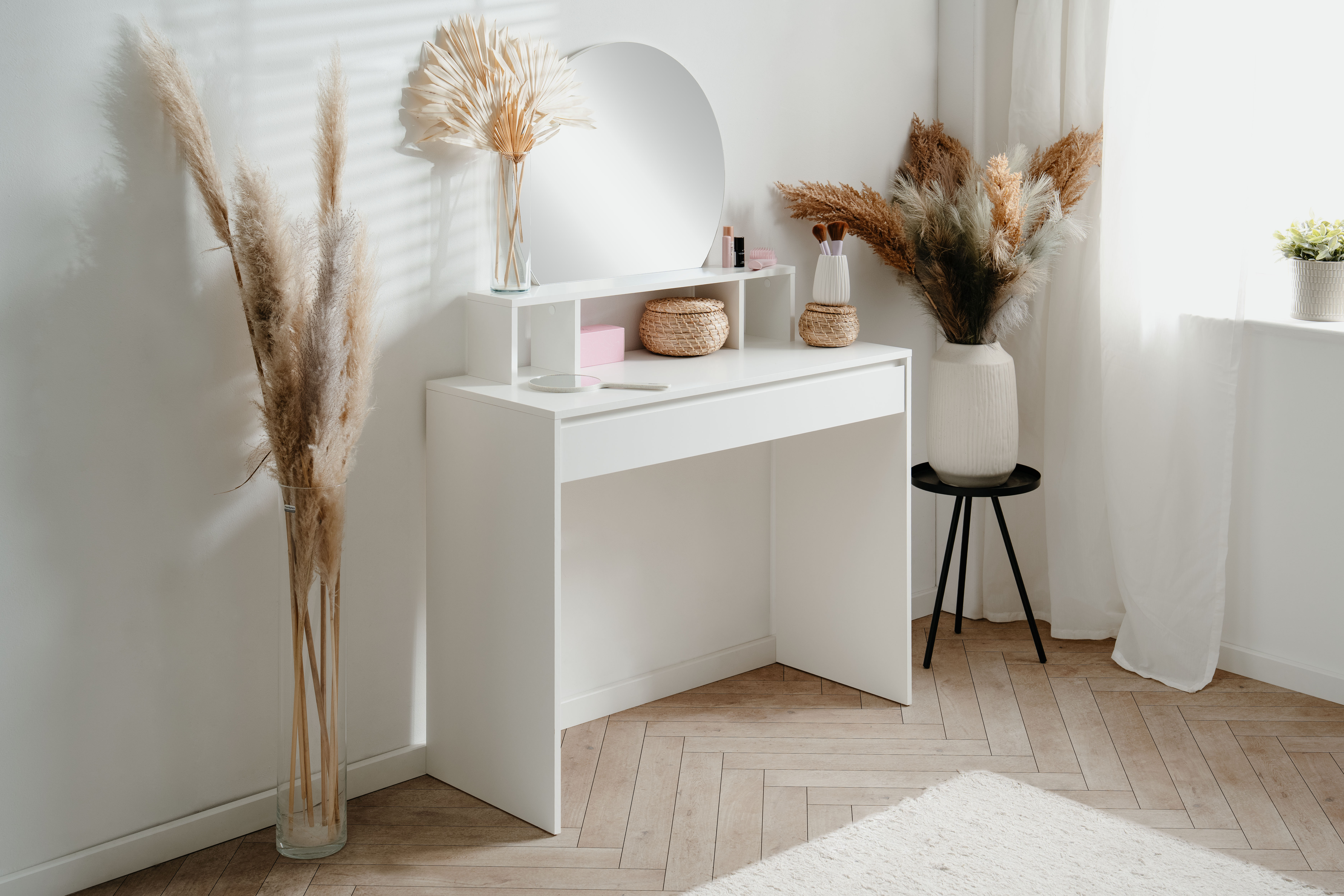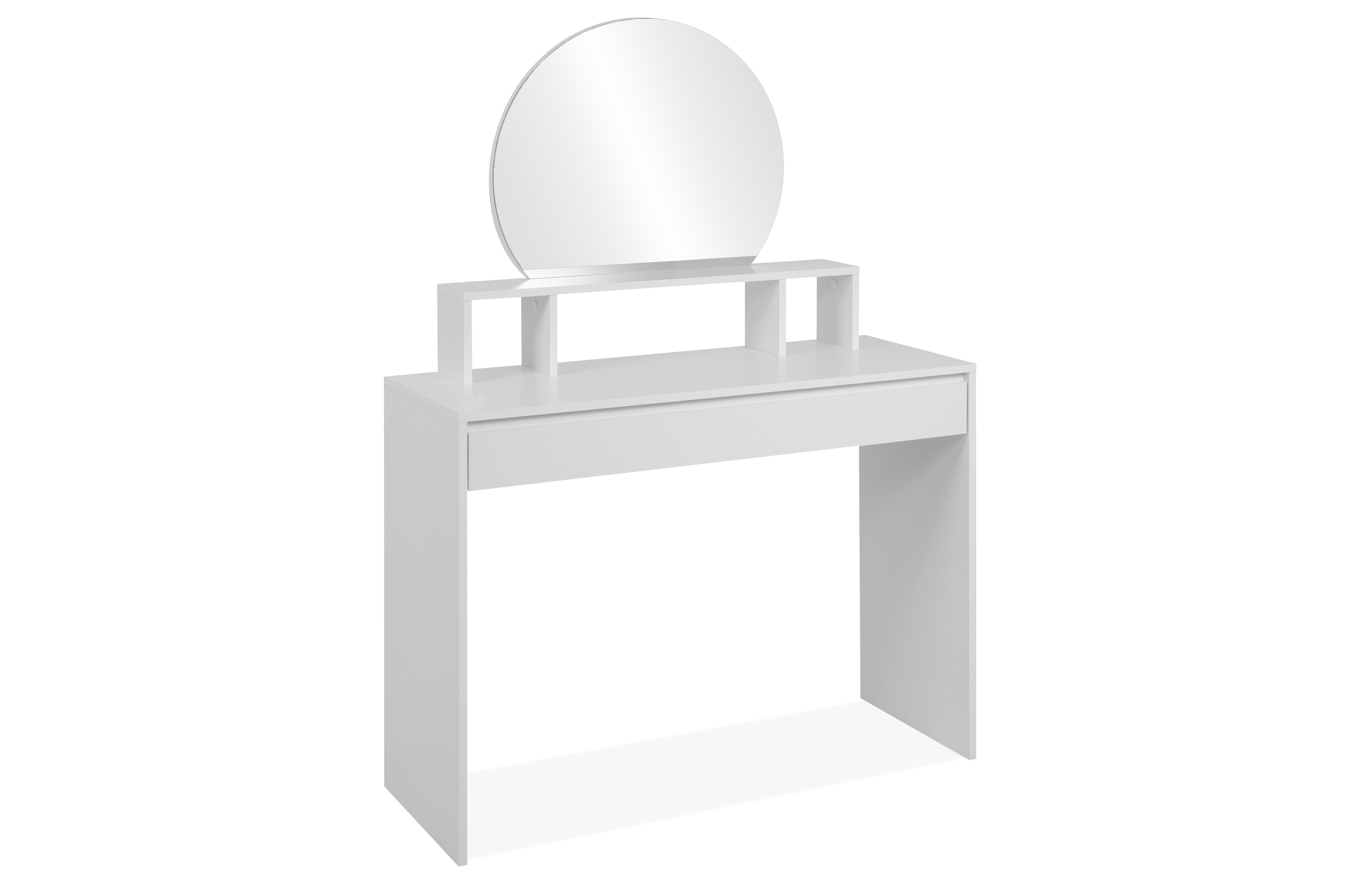 Dale estilo y funcionalidad a tu espacio con el tocador IMAGE en color blanco. Cuenta con un elegante espejo circular y un práctico cajón para mantener tus accesorios organizados. Su estructura de panel de partículas garantiza resistencia y durabilidad. Con medidas de 100 cm de ancho, 140 cm de alto y 40 cm de fondo, es ideal para dormitorios modernos. ¡Un toque sofisticado y práctico para tu rutina diaria!