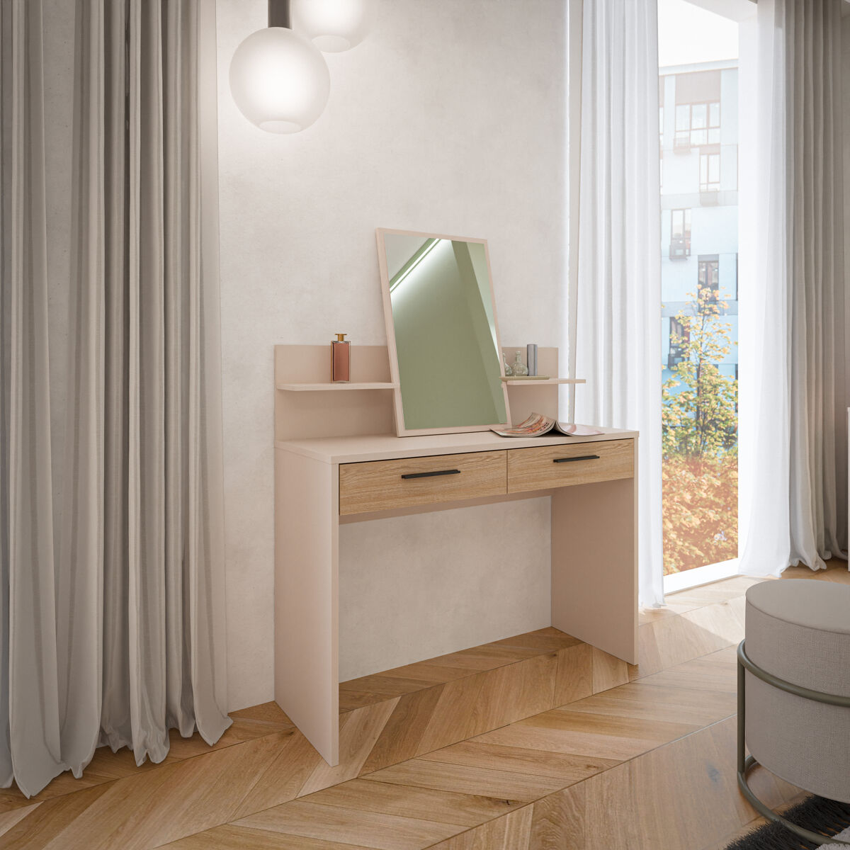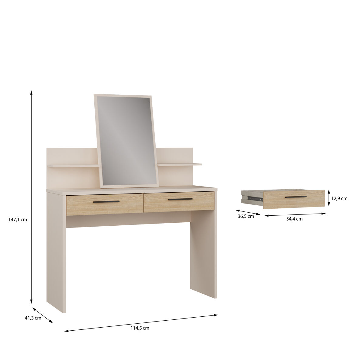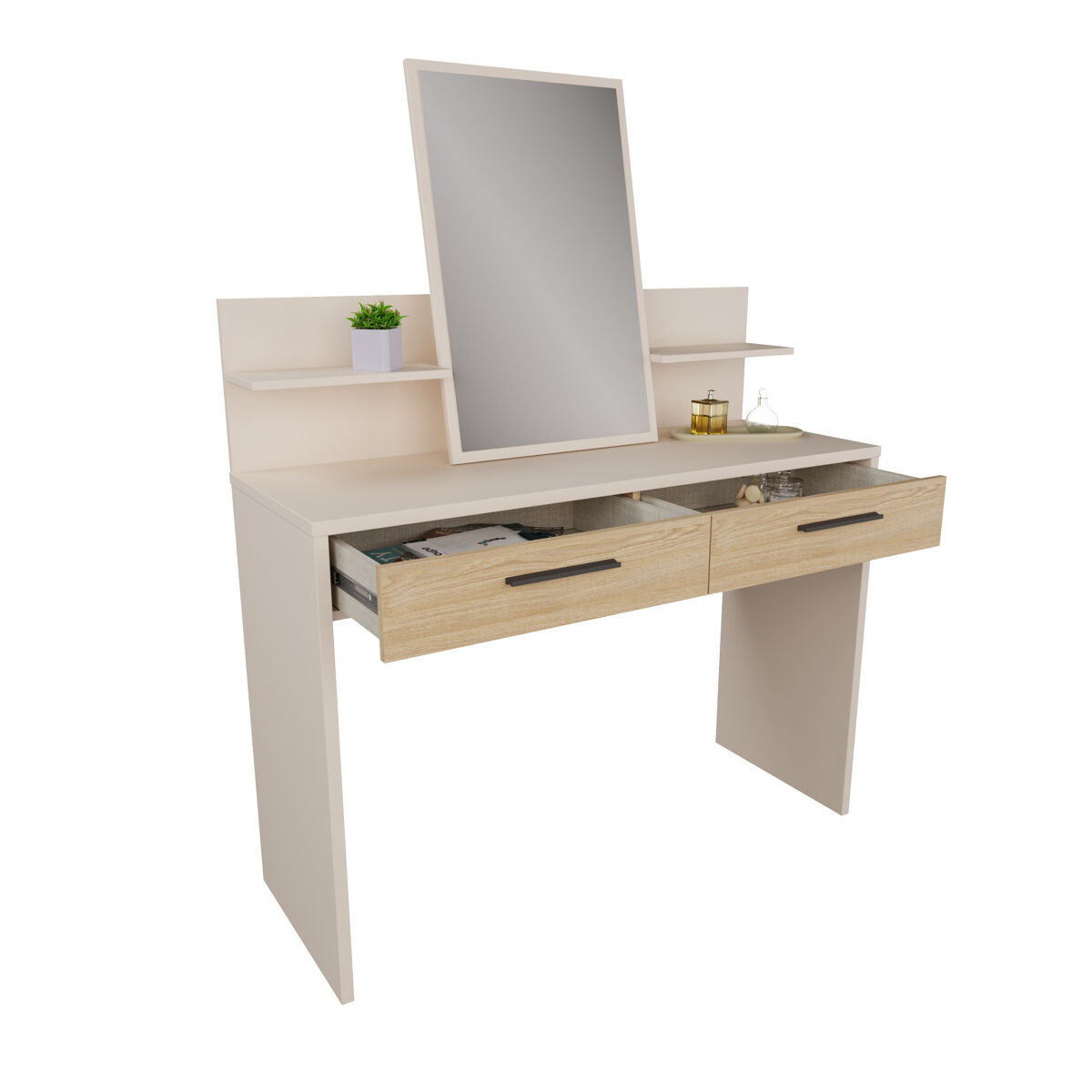 El tocador TOSCANA con espejo y 2 cajones en roble y crema es la pieza ideal para añadir funcionalidad y estilo a tu dormitorio. Su diseño elegante combina el color cálido del roble con detalles en crema, ofreciendo un espacio perfecto para tu rutina de belleza. Los dos cajones proporcionan almacenamiento práctico para tus accesorios y productos de cuidado personal. El espejo amplio facilita el arreglo diario, mientras que su estructura robusta asegura durabilidad. Este tocador no solo es útil, sino también un elemento decorativo que realza cualquier espacio. ¡Transforma tu habitación con este exquisito mueble!