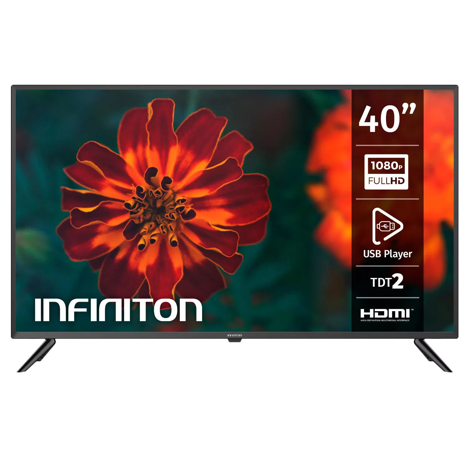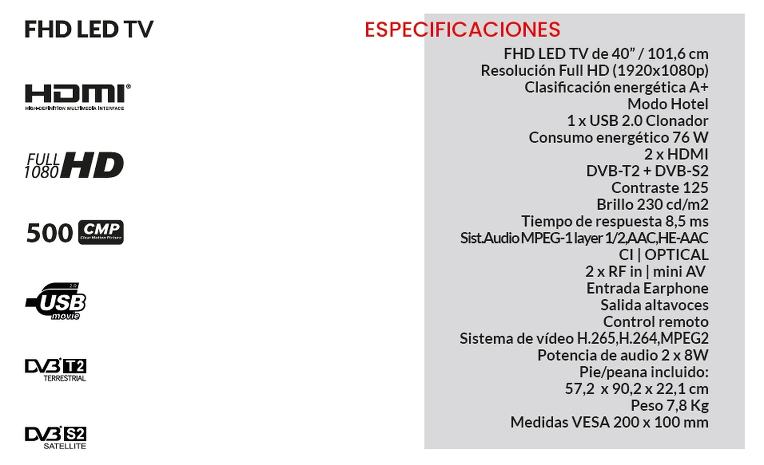 HD Ready TV de 40” / 101,6 cm. Resolución Full HD (1920x1080p). Clasificación energética A+. Conector USB 2.0 x 2. Consumo energético 74 W. Conector HDMI 2.1 x 3. DVB-T2 + DVB-S2. Contraste 3000:1. Brillo 230 cd/m2. Tiempo de respuesta 8,5 ms. Sist.Audio MPEG-1 layer 1/2,AAC,HE-AAC. RJ45 | CI | OPTICAL. Conector RF in | mini AV x 2. Entrada Earphone. Salida altavoces. Control remoto. Sistema de vídeo H.265,H.264,MPEG2. Potencia de audio 2 x 8W. Sin pie/peana incluido:. 51,3 x 90,2 x 7,5 cm. Pie/peana incluido:. 57,4 x 90,2 x 22 cm. Peso 7,8 Kg. Medidas VESA 200 x 100 mm. Medidas de pie a pie: 875,6 mm