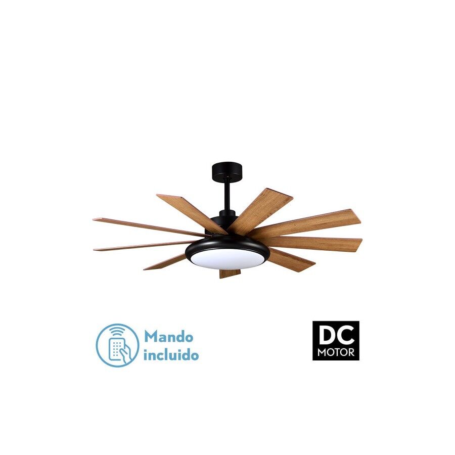 Ventilador de la serie PIREO realizado en metal, MDF y policarbonato, en color NEGRO con nueve aspas REVERSIBLES de color ROBLE/HAYA.Tiene 6 velocidades ajustables. Motor DC, con Tecnología LED INTEGRADA con una potencia de 36 watios, con 3 TEMPERATURAS DE LUZ( 3000-4500-6000K) y 3800 lúmenes.Su medida es de 41,4/58,8x132x132 centímetros, viene con dos medidas de Tija lo que permite adaptarlo para distintas alturas de techo.Control de aire verano o invierno. Mando a distancia INCLUIDO con MEMORIA DE COLOR incorporada y TEMPORIZADOR 1/2/4/8 H. Modelo también disponible en blanco-roble/haya.Al igual que las lámparas, los ventiladores de techo son un elemento decorativo más dentro de la estancia. Ha de elegirse el más adecuado para tu espacio según tu estilo: líneas modernas, clásicas, rústicas, para ambientes infantiles...Es uno de los aspectos que más nos preocupa.¿Será lo suficientemente silencioso?. Podemos decir que todos nuestros ventiladores de techo están preparados para hacer un nivel de sonido muy bajo que no impide el sueño, sobre todo cuando se trata de habitaciones. Todos ellos son silenciosos y apropiados para la mayoría de situaciones.El NIVEL DE SONIDO de un ventilador, en general, proviene de estas tres fuentes:1. De la velocidad de rotación: se produce nivel de sonido derivado del aire que se desliza por las palas al cortar el aire en su movimiento de rotación. A mayor velocidad, mayor nivel de sonido. Por ello es mejor un ventilador grande girando despacio que uno pequeño girando rápido.2. Del tipo de motor: los motores DC, de corriente continua, son más silenciosos y consumen un 70% menos de energía que los convencionales AC, de corriente alterna.3. Del fabricante: la calidad de los materiales y su construcción, pensados para no hacer nivel de sonido es tambien una premisa a tener en cuenta. Es lo que diferencia un ventilador más barato, con las mismas características de uno más caro. Algunos de nuestros productos estánfabricados con un estándar de calidad altísimo que marca la diferencia con respecto a modelos más económicosHay tres posibilidades para encender y apagar los ventiladores de techo, conjuntamente con la luz incorporada:1. Cadena: Todos los ventiladores traen dos cadenas: una es para la luz y otra es para las distintas velocidades del ventilador.2. Mando a distancia: también permite controlar la luz y el ventilador de forma independiente. Los modelos que no incluyen el mando a distancia pueden aceptar un mando a distancia opcional, cuando se indica en cada artículo. En el apartado de ACCESORIOS, puedes adquirir el kit completo de receptor y mando a distancia, que se conecta al aparato mediante infrarrojos.3. Regulador de pared: normalmente dispone de un interruptor de luz y un selector de velocidades.Lo diferencia del mando a distancia en que siempre va a estar localizable, situado en el lugar de entrada y salida de las habitaciones, y se puede accionar o desconectar junto con la luz.Cuando sustituimos la lámpara de techo por el ventilador , el ventilador podrá ser encendido y apagado con el mismo interruptor de pared que hasta el momento controlaba solo la luz.Para la instalación o conexión a la red de un ventilador de techo con luz ha de saberse que el ventilador siempre dispone de dos entradas independientes, una para el ventilador y otra para la luz. Si queremos regular el funcionamiento desde la pared, usaremos un interruptor de pared doble, donde controlemos por un lado el ventilador y por otro la iluminación. Para ajustar la velocidad del ventilador, accionaríamos la cadena. Algunos incluyen, además, la función programador o temporizador para el encendidoy apagado automáticos.Velocidad Potencia Rpm Flujo Aire Nivel sonido1 6 W 90 rpm 3700 m3 36 dB2 9,5 W 110 rpm 4500 m3 38 dB3 14 W 130 rpm 5300 m3 39 dB4 21 W 150 rpm 6000 m3 40 dB5 31 W 170 rpm 6500 m3 42 dB6 40 W 190 rpm 7000 m3 45 dBAccionando el interruptor en invierno las aspas giraran en sentido contrario, de esa forma fuerza el aire caliente que se acumula en el techo de la habitación hacia abajo, homogenizando la temperatura y ahorrando el consumo en calefacción, así conseguimos una sensación muy confortable en los meses de mas frío y humedad.Por su diseño podras elegir entre sus tres temperaturas de color de luz, para elegir la que mejor se adapte en cada momento, todo ello desde el control remoto y sin renunciar al mas moderno estilo y diseño.Otra ventaja de la función inversa es que podemos ventilar la habitación sin que nos de la brisa directamente.Hay que tener en cuenta la normativa de seguridad. Los ventiladores de techo son productos que pertenecen a la clase eléctrica I. Por lo tanto, deben estar conectados a tierra y están prohibidos para su uso en el cuarto de baño.Normalmente cuando termina el verano y entramos en el frío invierno, todos nos olvidamos del ventilador y queda solo como una lámpara o un objeto decorativo.Mucha gente cree que los ventiladores de techo sólo son útiles en verano, para refrescar la estancia. Sin embargo, debido a los ultimos acontecimientos y recomendaciones, mucha gente está instalando este tipo de ventilador tambien para mantener su vivienda perfectamente ventilada.Si necesita mas informacion sobre este producto no dude en contactar con nosotros y estaremos encantados de atenderle.