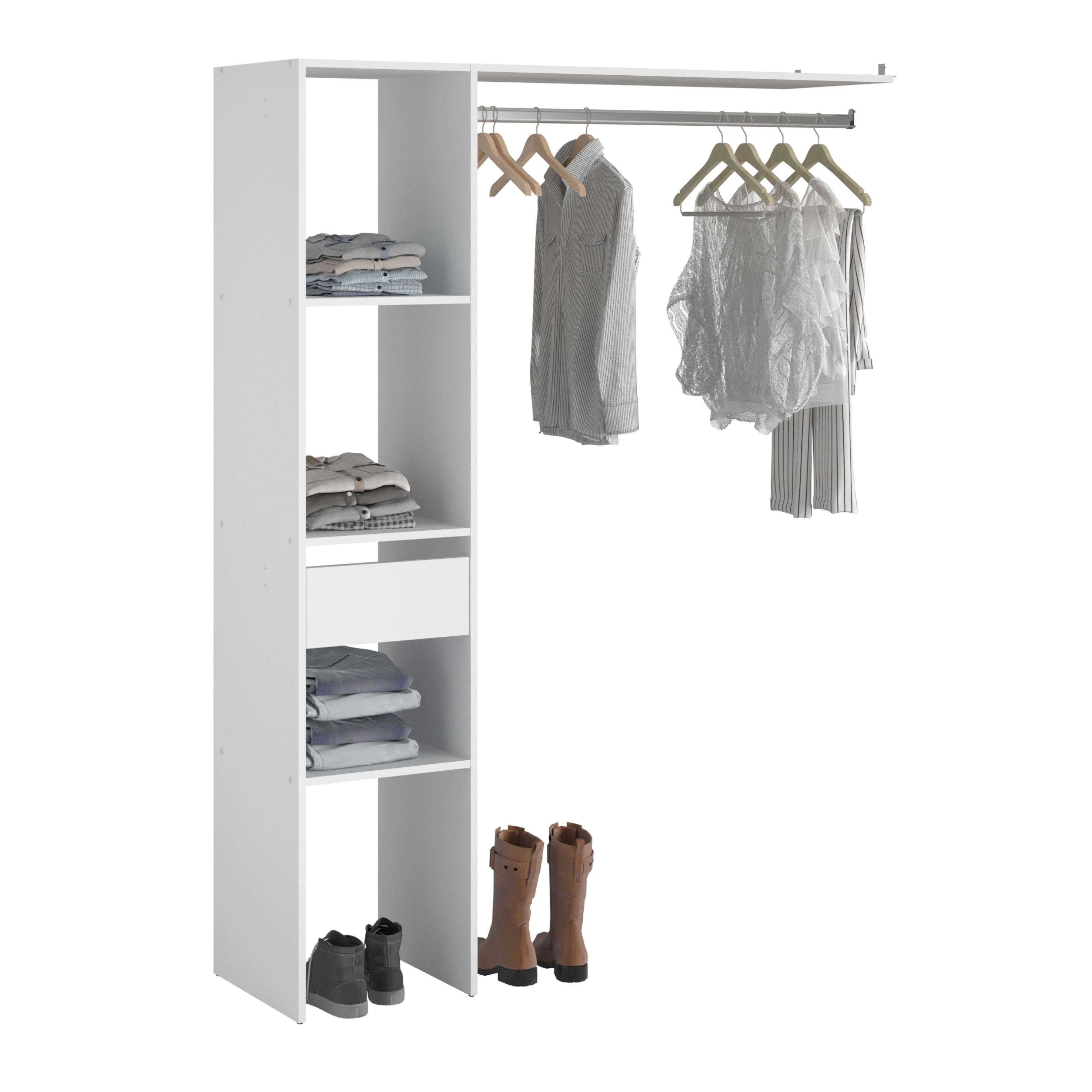 Dale un toque diferente a tu dormitorio o vestidor con este armario abierto Custom Opción F+G, Su estructura cuenta con 2 cajones, 2 barras y diferentes baldas y estantes dónde organizar tu ropa a tu gusto, Incluye una cortina con la que resguardar tu ropa del polvo, Este vestidor aporta un extra de funcionalidad, Ubica el sitio a tus pantalones, camisetas y accesorios de la mejor manera, Añadelo a tu dormitorio, Fabricado en melamina y acabado en color blanco mate, Sientete como una superestrella con este armario abierto, No incluye otros muebles ni elementos decorativos de las imágenes, Medidas: Ancho 176 cm Alto 200 cm Profunidad 40 cm Se trata de mobiliario con kit de montaje, que incluye manual de instrucciones y tornillería,